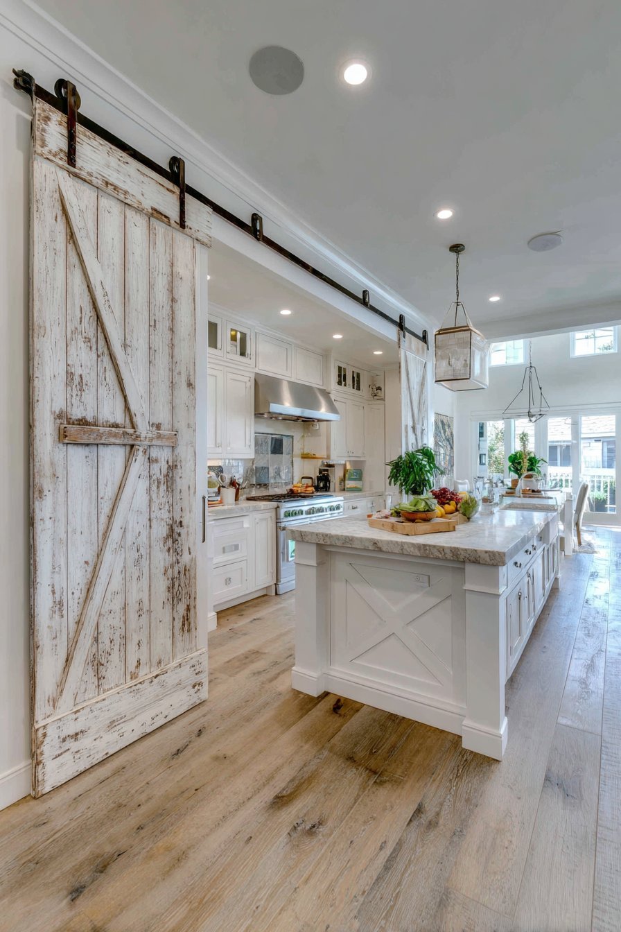A white-painted barn door features classic X-pattern design. The farmhouse aesthetic separates the pantry from the main cooking area. Oil-rubbed bronze hardware includes decorative strap hinges and rolling track. The combination creates authentic vintage appeal.