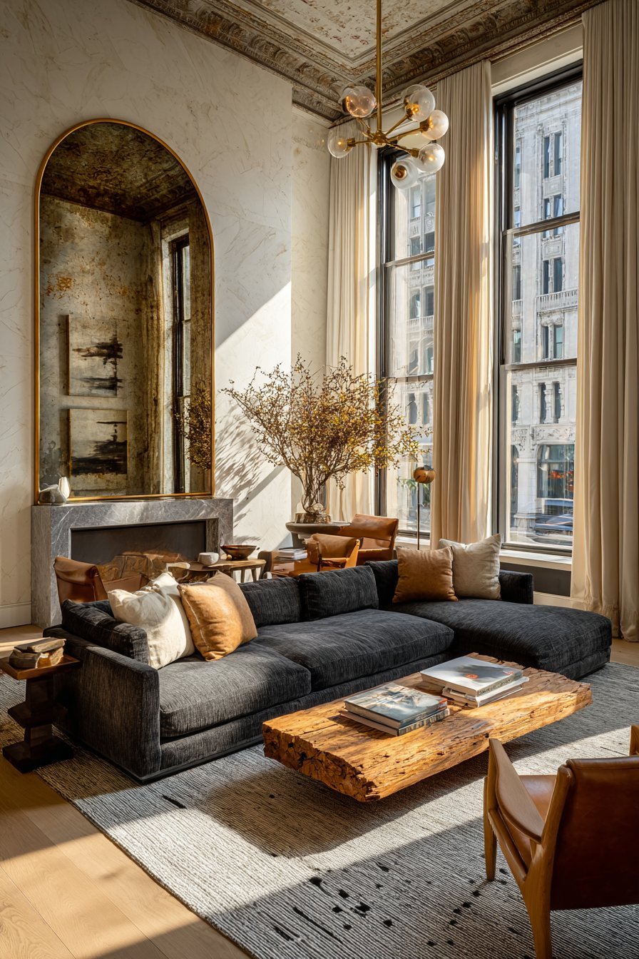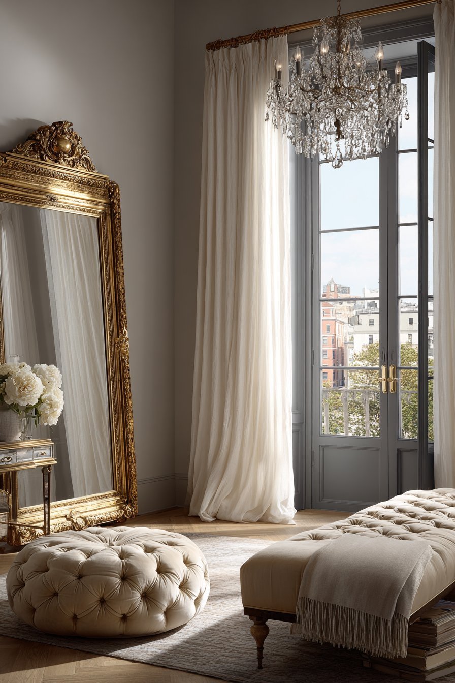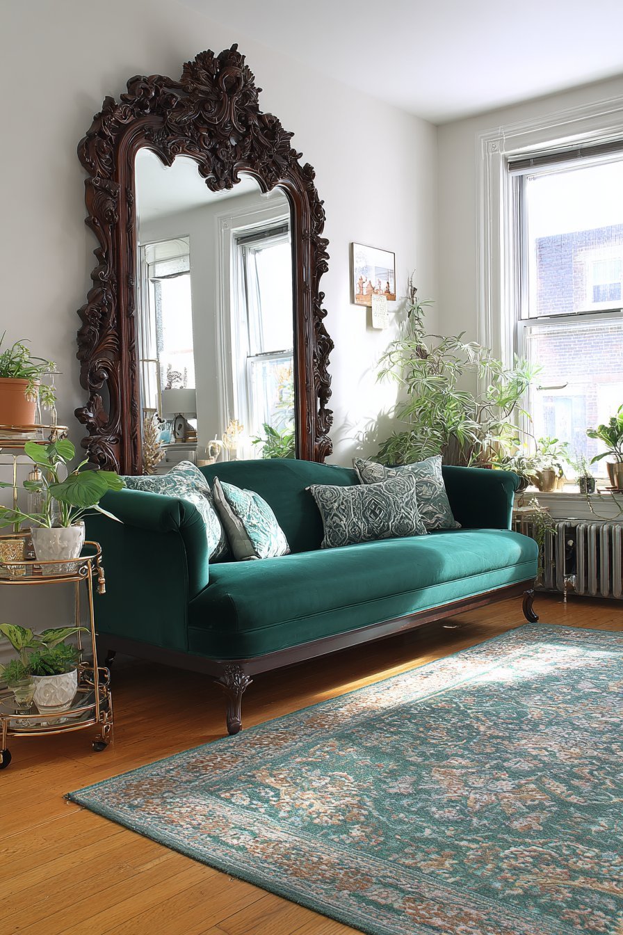 The mirror’s placement strategically doubles the room’s perceived dimensions. A low-profile grey linen sofa sits nearby with complementary vintage leather ottoman. Natural jute rugs anchor the seating area. Morning light creates gentle shadows that highlight ornate frame details beautifully.