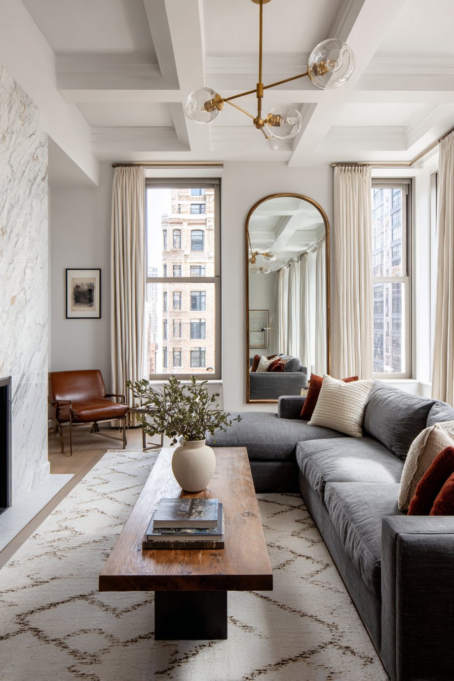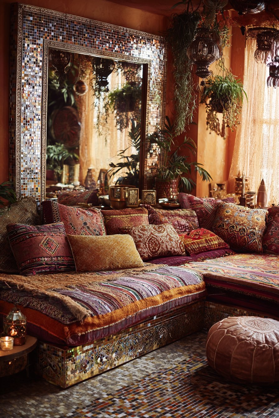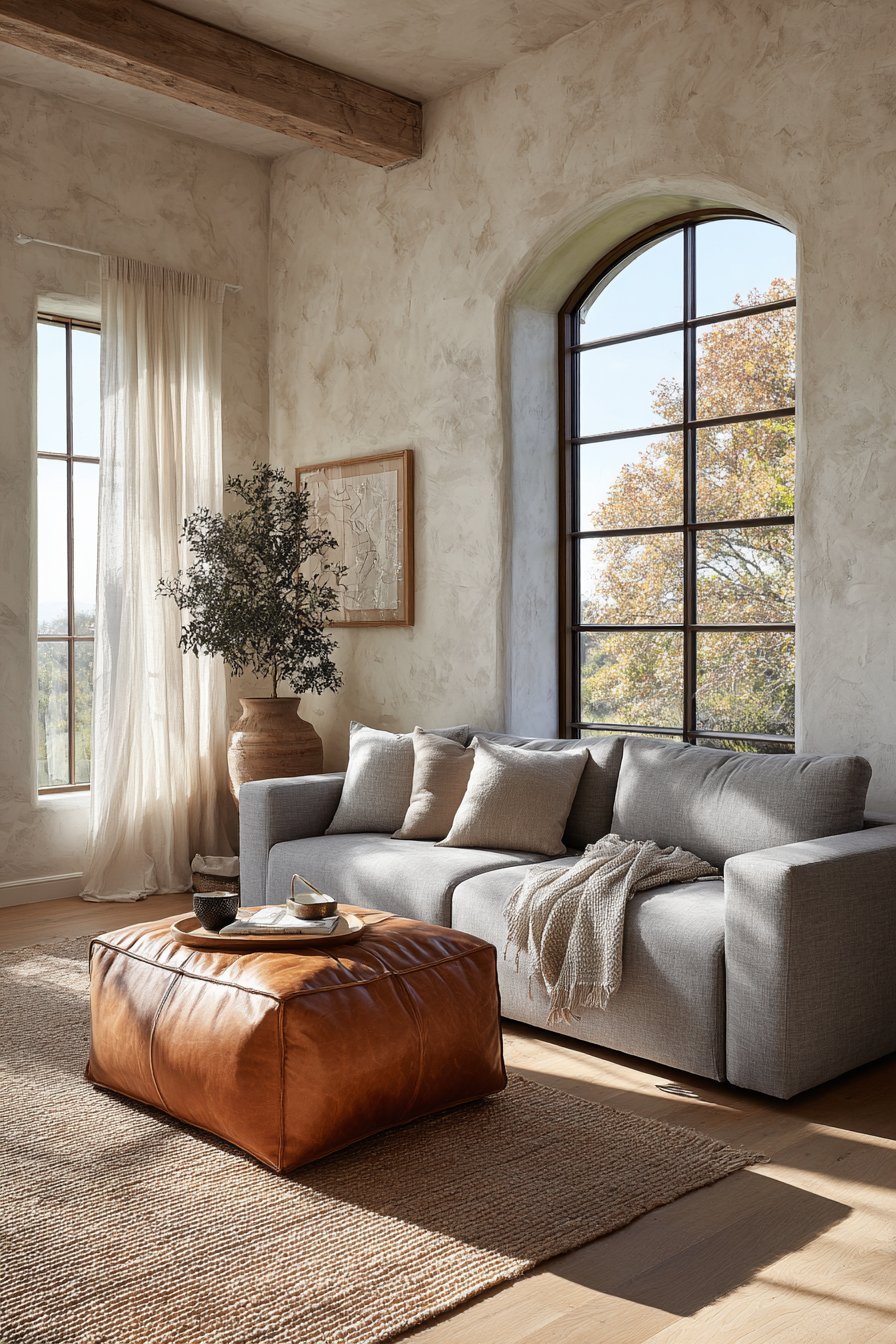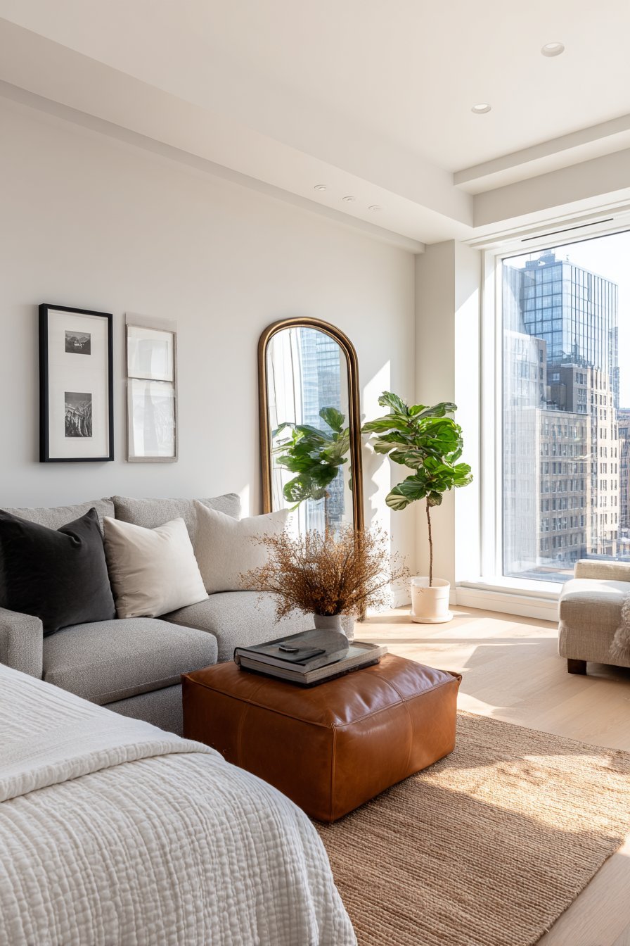 The mirror’s placement strategically doubles the room’s perceived dimensions. A low-profile grey linen sofa sits nearby with complementary vintage leather ottoman. Natural jute rugs anchor the seating area. Morning light creates gentle shadows that highlight ornate frame details beautifully.