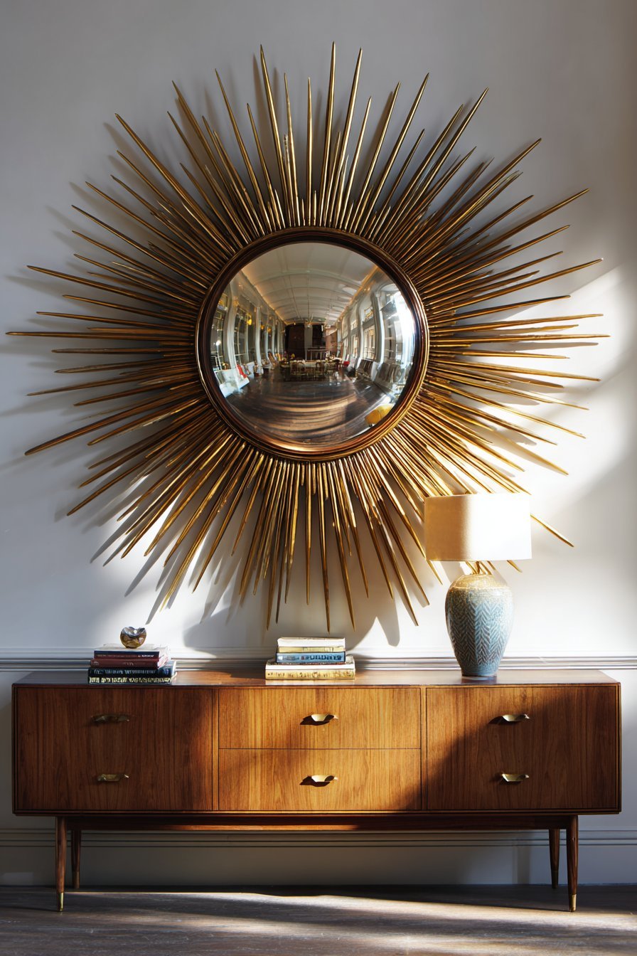 Starburst mirrors represent iconic mid-century modern design. The radiating wood rays create a sculptural three-dimensional impact. Convex centers add unique reflective distortion. This suits spaces celebrating vintage design movements authentically.