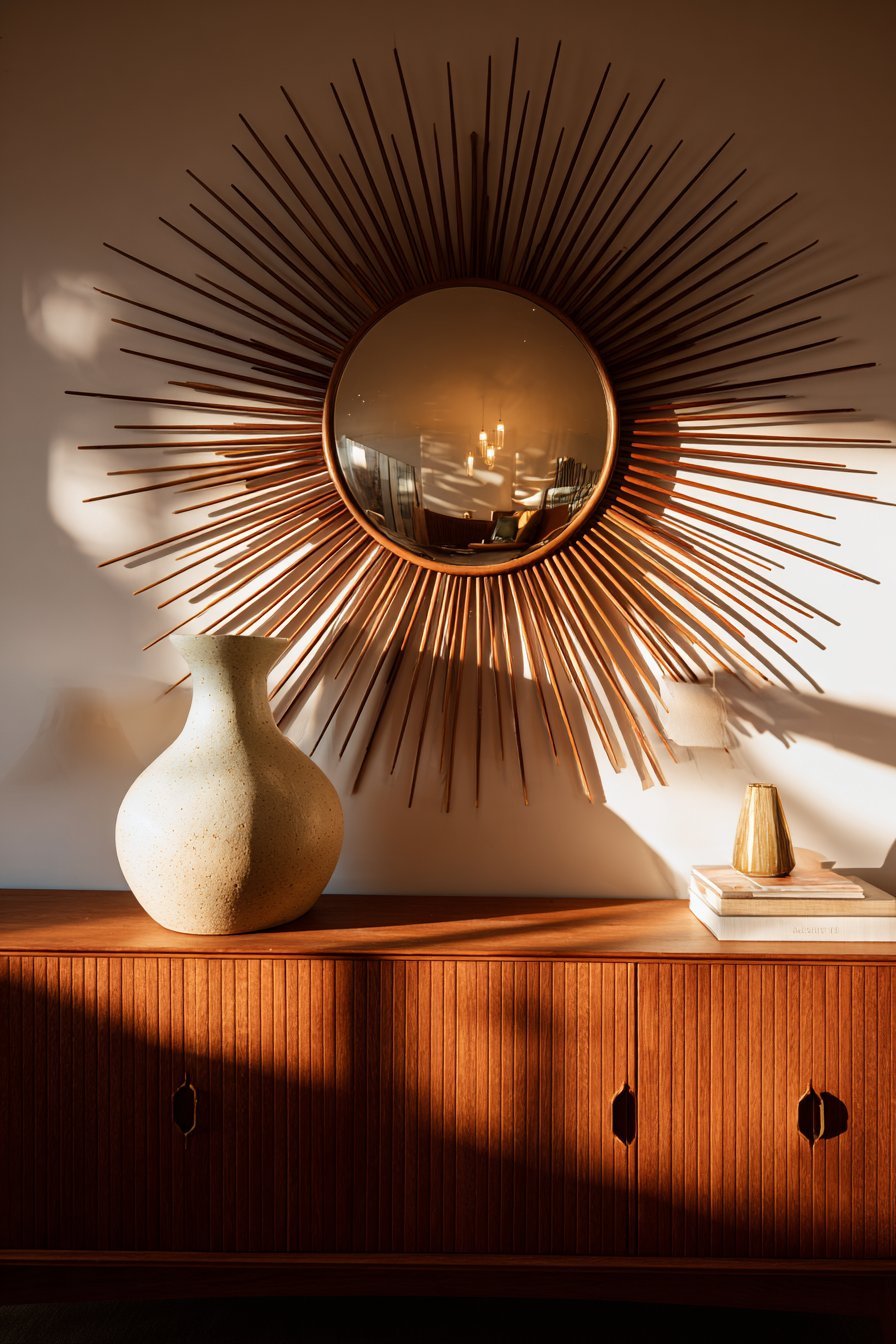 An iconic starburst mirror features walnut wood rays radiating outward. Convex center creates unique dimensional reflection. The sculptural piece hangs above low teak credenza. Tapered legs and brass hardware maintain period authenticity.