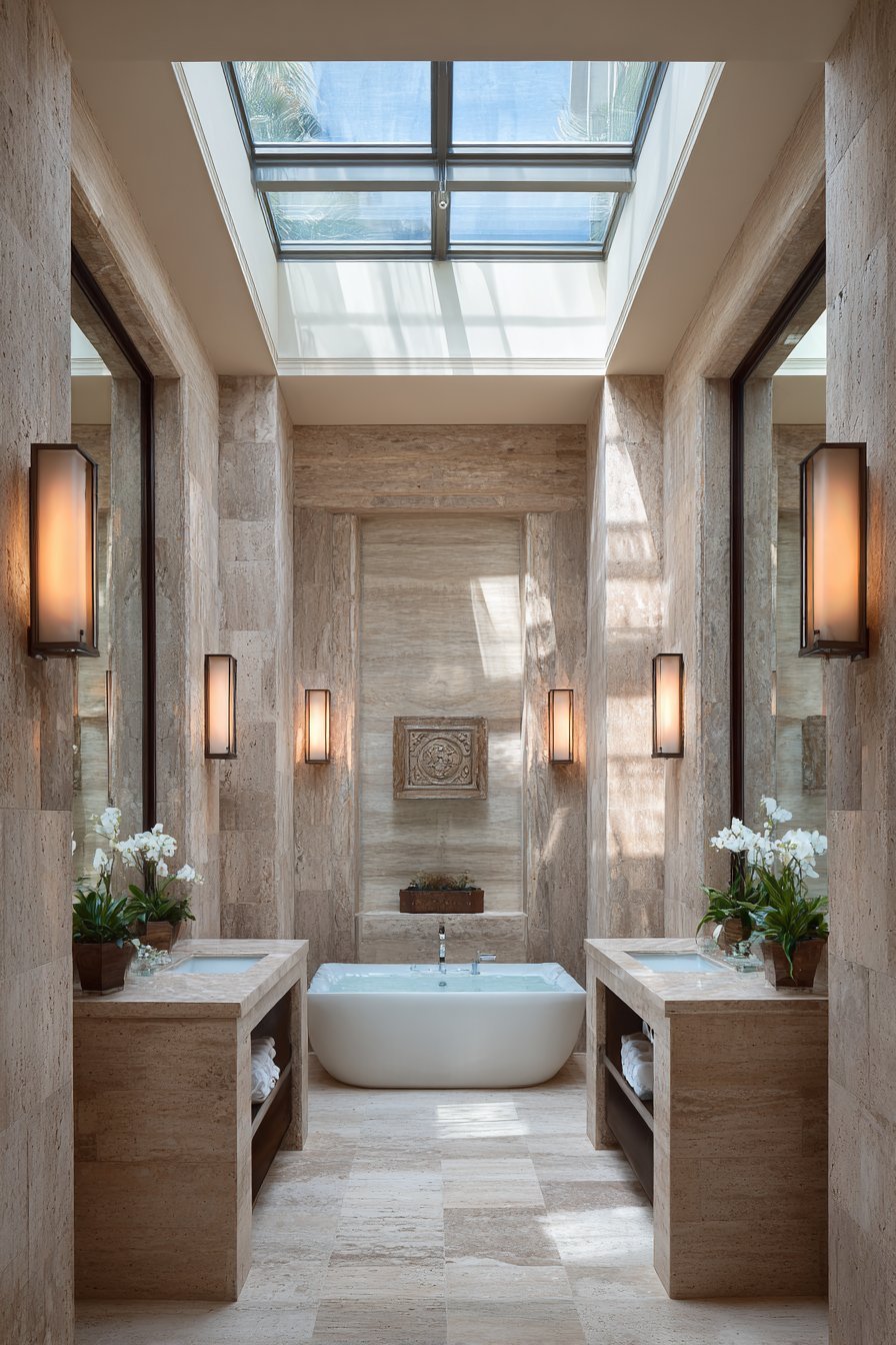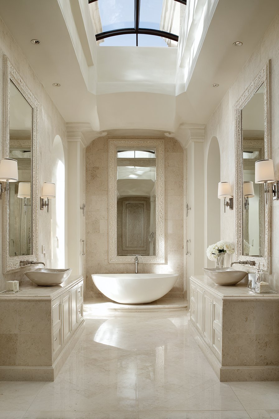 Natural light from skylight bathes the space in soft illumination. The limestone carving demonstrates exceptional craftsmanship. His-and-hers vanities receive equal treatment through matching mirrors. The grand scale creates luxurious bathroom symmetry.