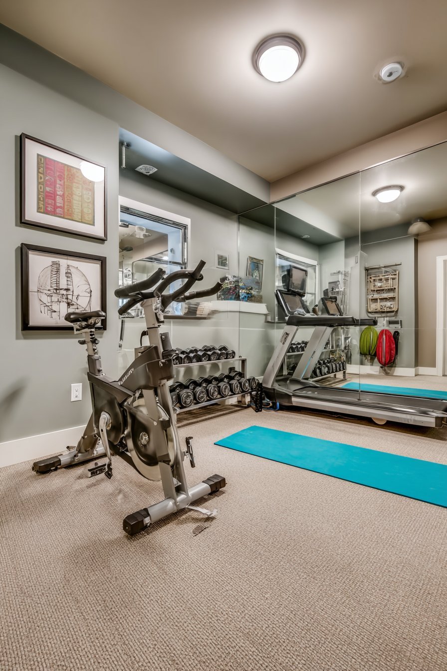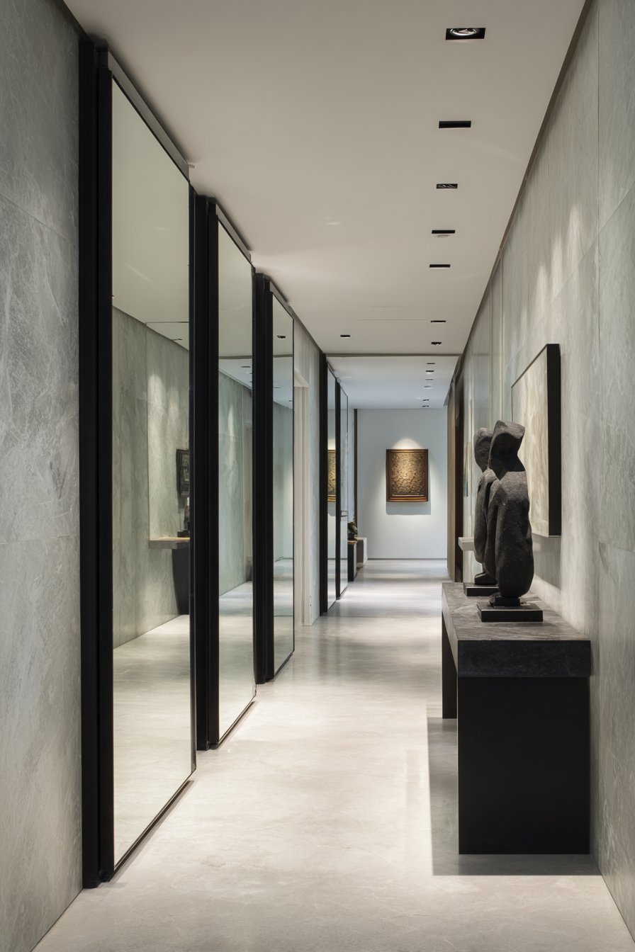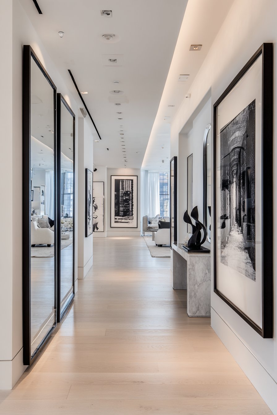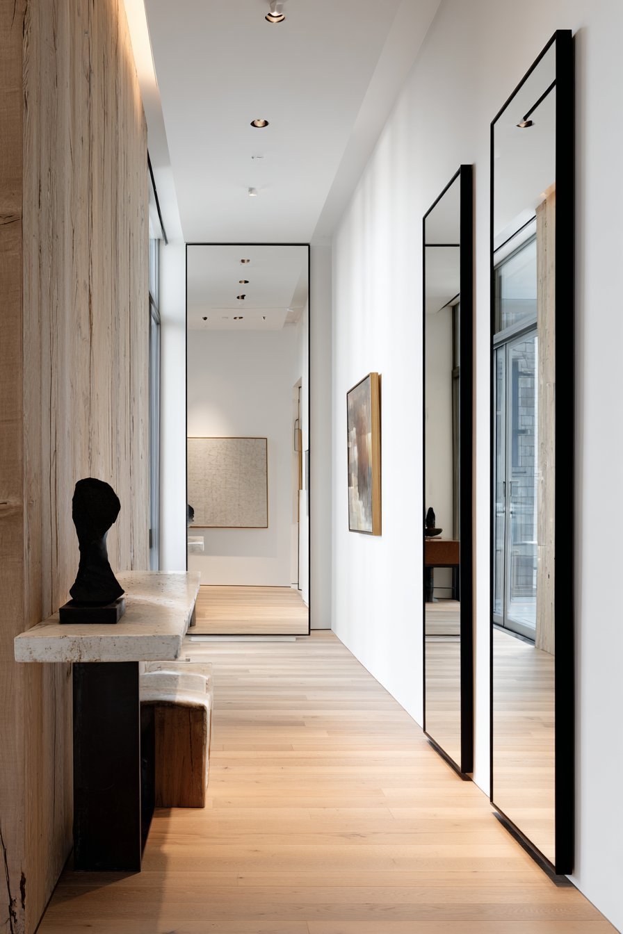 A massive rectangular mirror with thin black metal framing spans nearly an entire wall. Mounted horizontally above a floating walnut console, it creates horizontal emphasis. The mirror reflects the opposite wall’s gallery arrangement and pendant lighting. This doubles visual interest throughout the space.