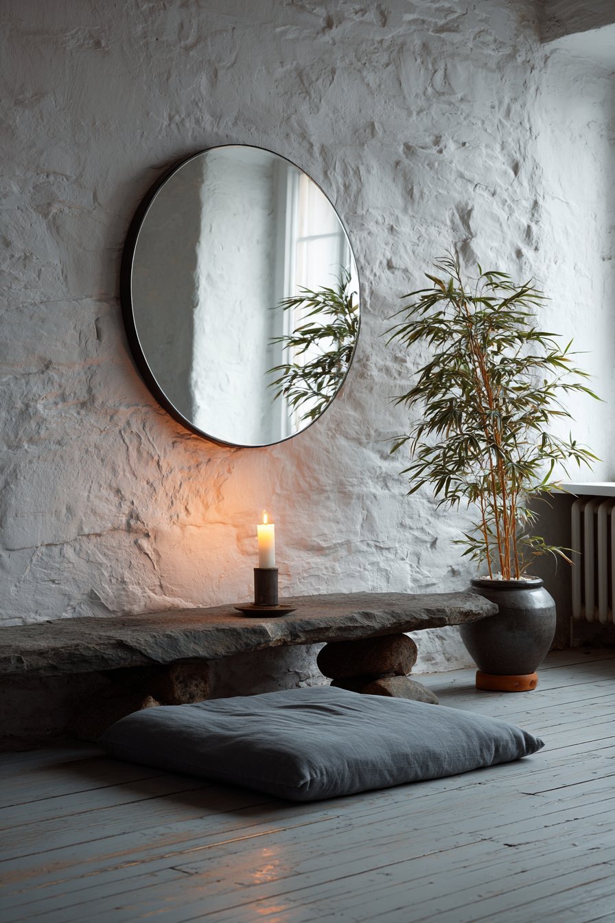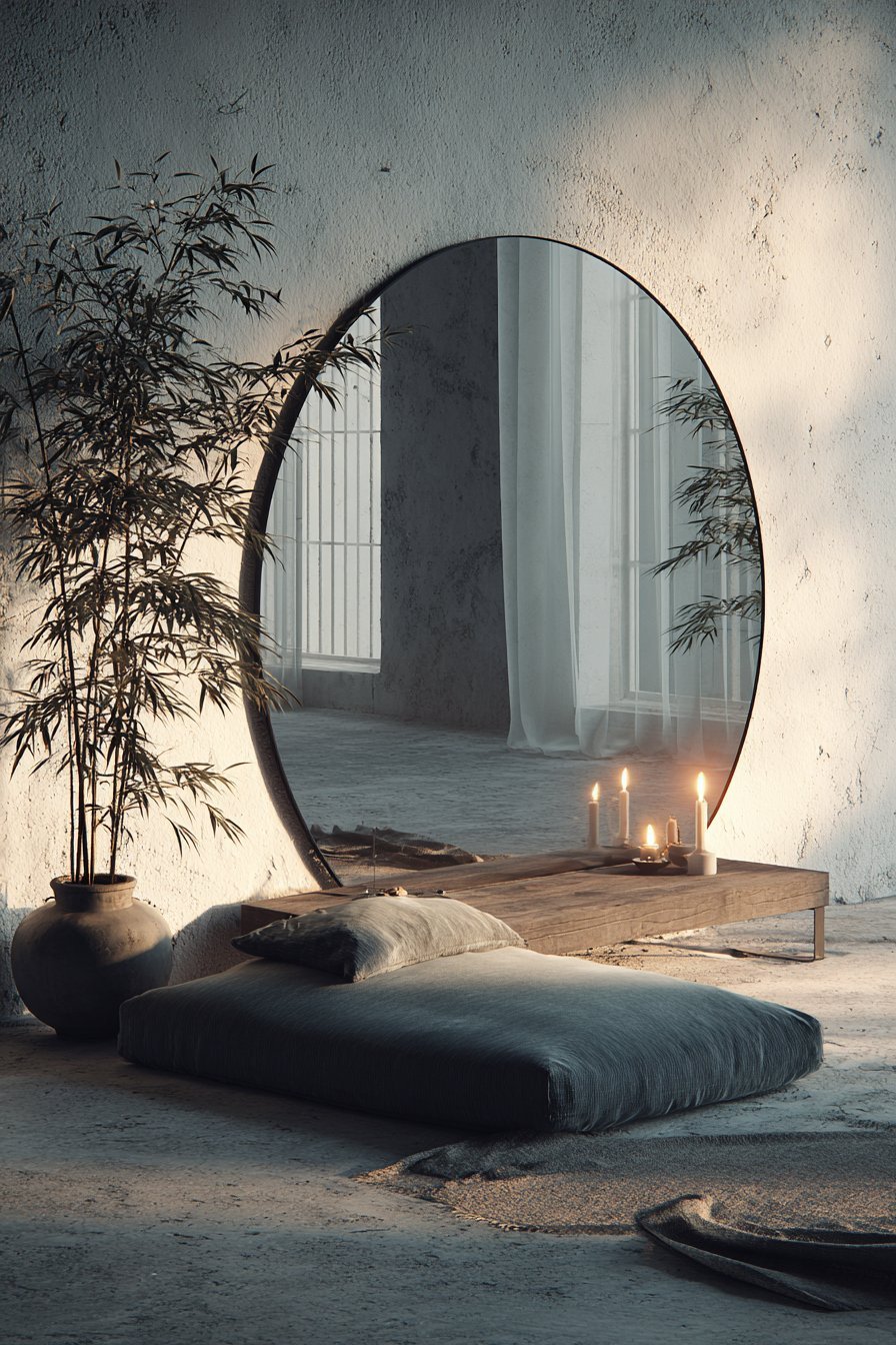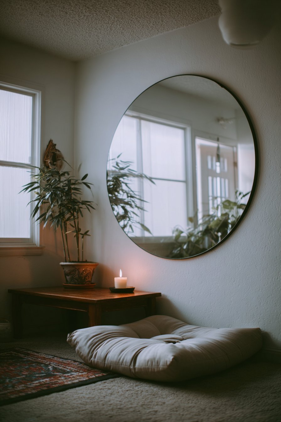 Warm afternoon light filters through sheer curtains beautifully. The mirror’s surface creates soft highlights on textured rattan. White linen bedding provides neutral foundation for eclectic styling. The circular form softens the angular room architecture naturally.