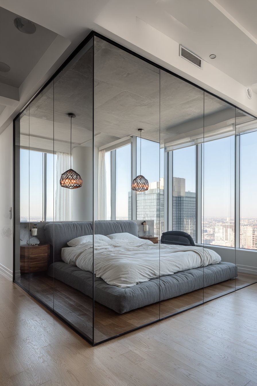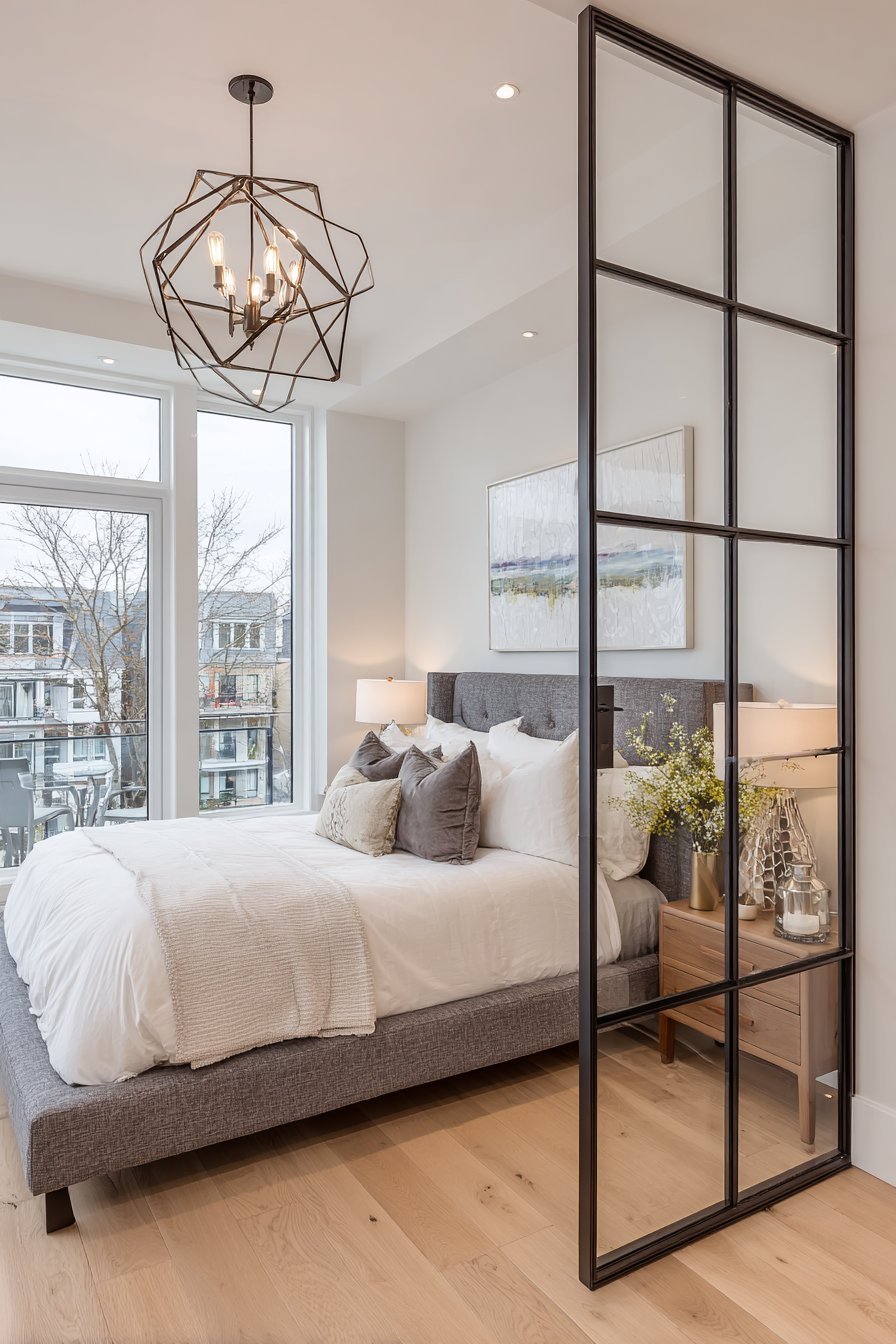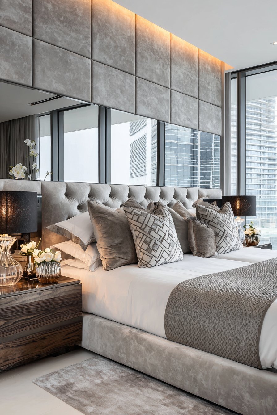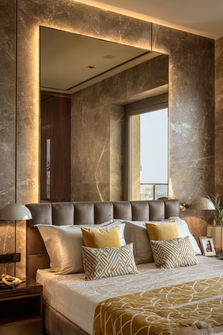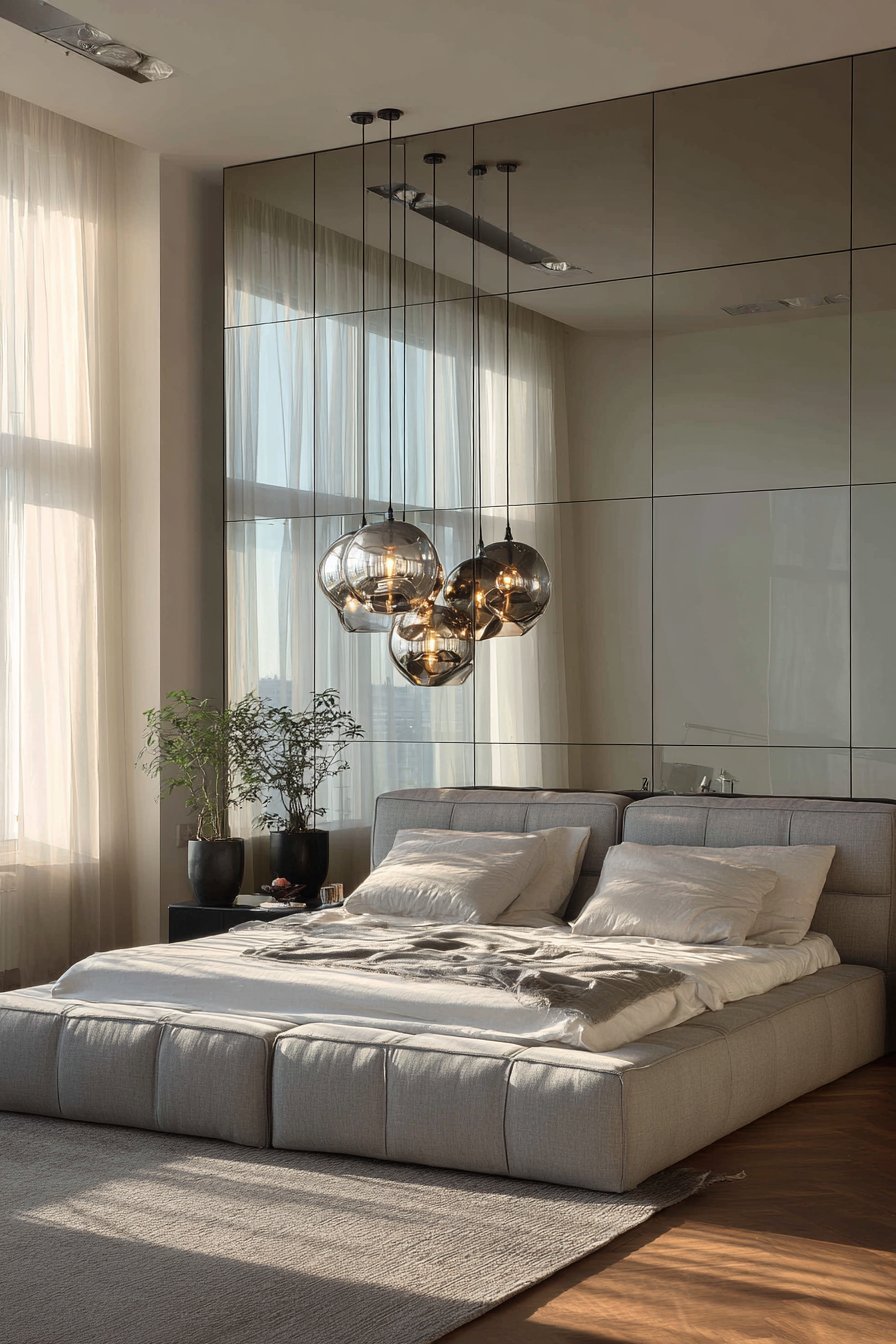 Full-wall mirrors create maximum spatial transformation. The floor-to-ceiling treatment suits modern bedroom drama. This requires professional installation and quality materials. The effect justifies investment through dramatic impact.