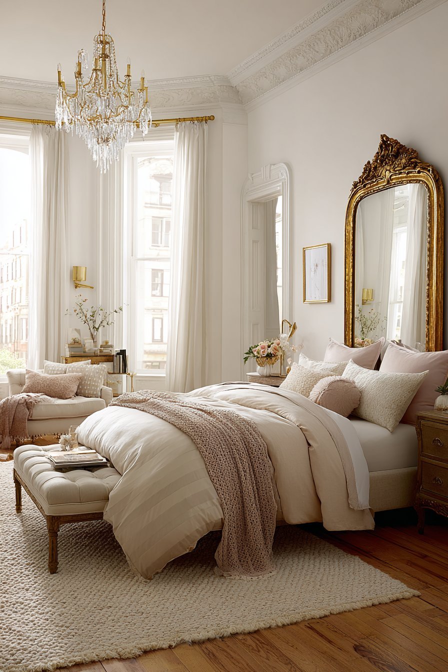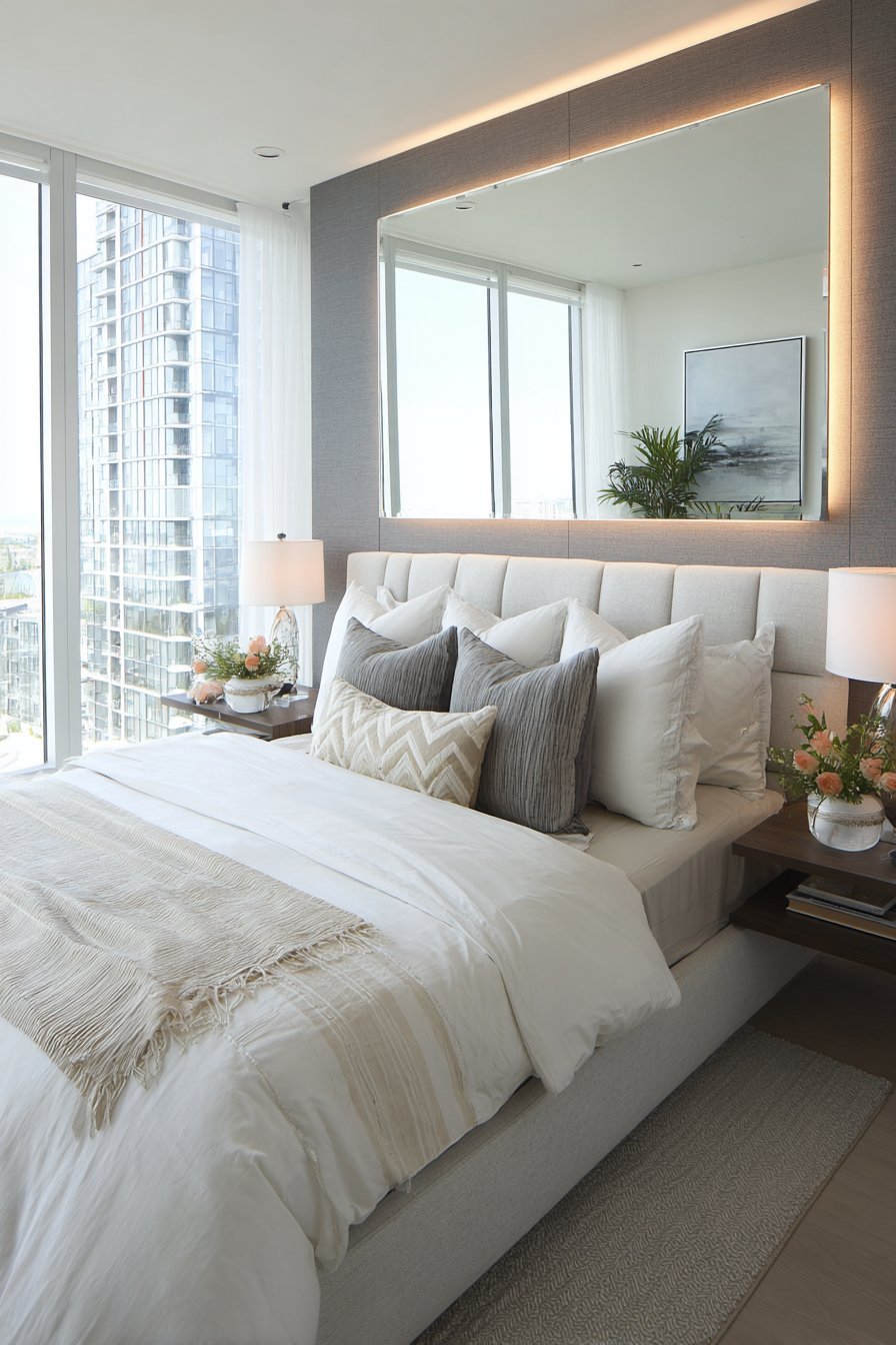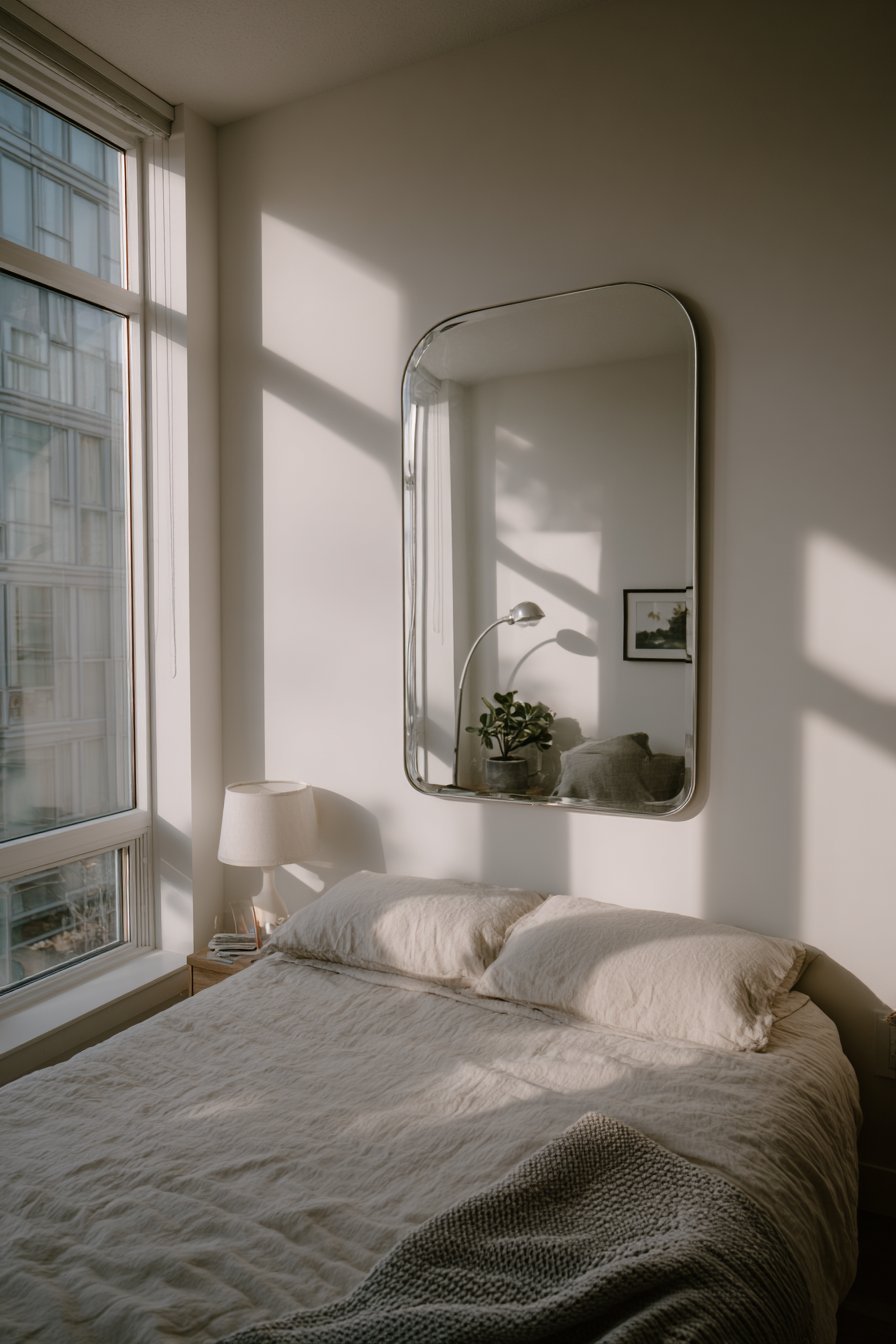 Soft morning light from opposite windows fills room and reflection. The bold scale creates a transformative spatial effect. The minimal framing maximizes contemporary aesthetics. The reflection literally doubles bedroom’s visual impact.