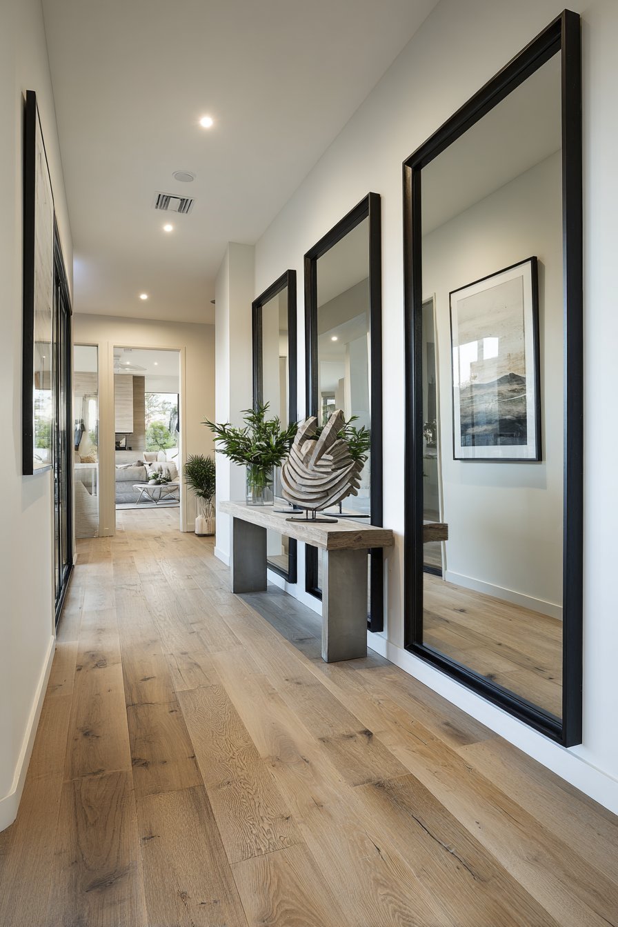 Black metal framing provides contemporary edge without overwhelming delicate design elements. The horizontal orientation suits narrow entryways perfectly. The reflection expands tight spaces dramatically. The thin frame maximizes reflective surface while maintaining structural integrity.