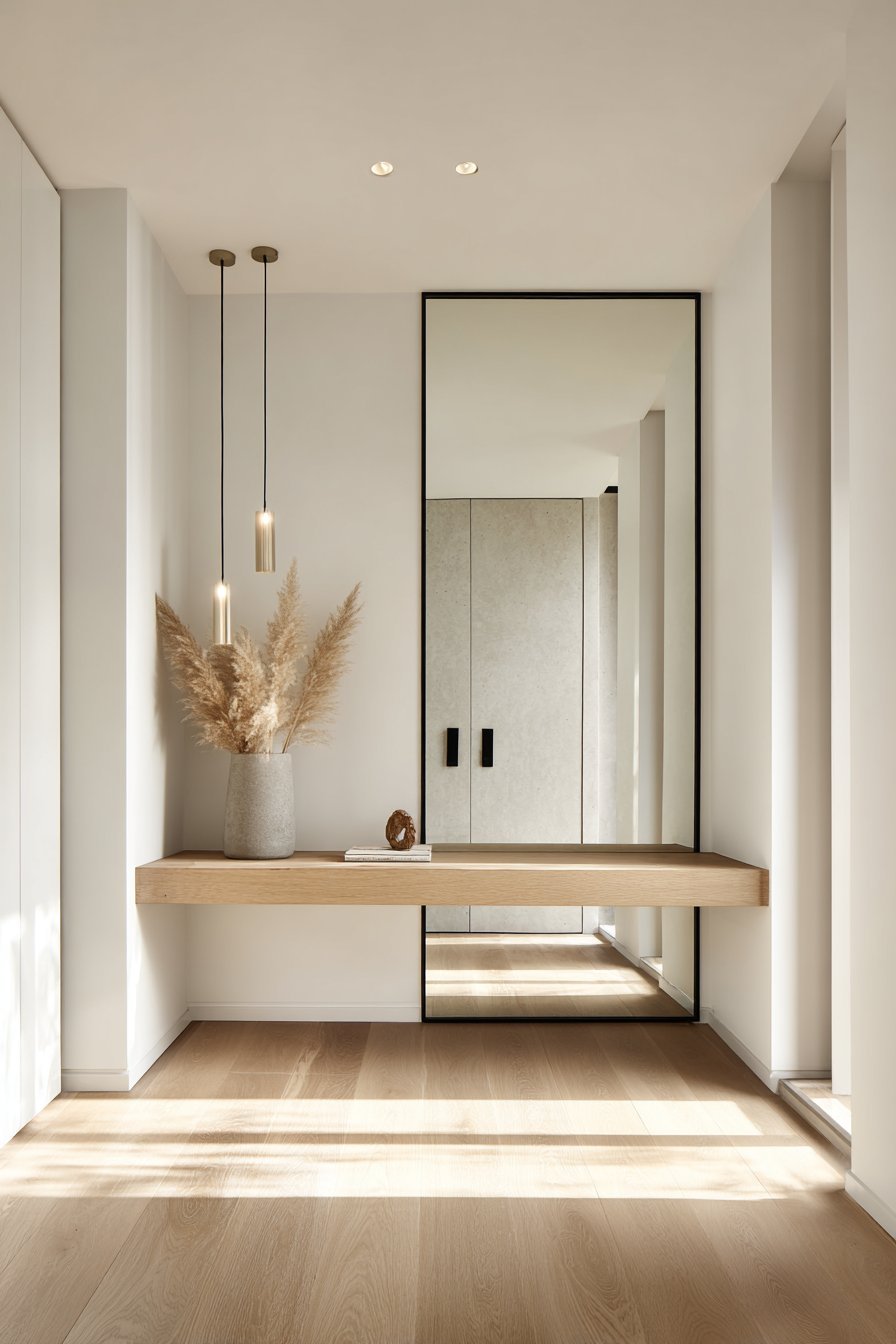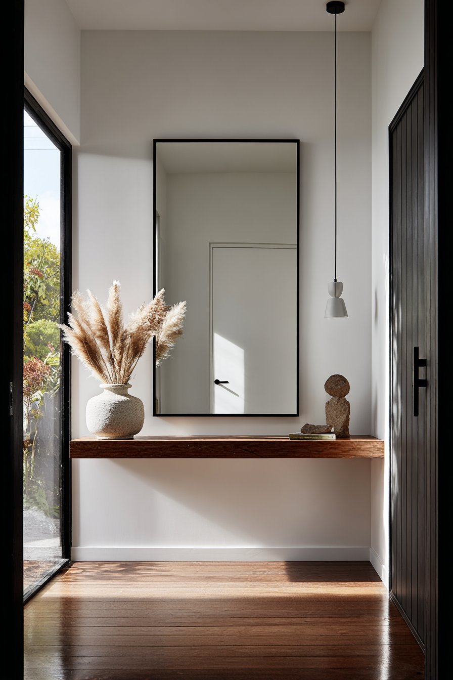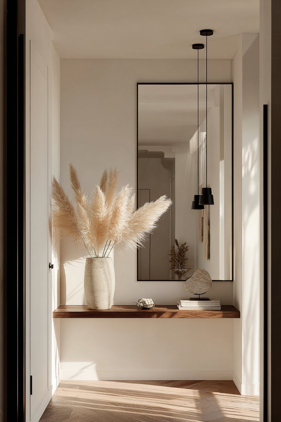 Natural daylight from a nearby door creates subtle surface reflections. A ceramic vase holds dried pampas grass alongside sculptural objects. The console styling remains intentionally minimal. The mirror’s architectural presence dominates through clean lines and substantial proportions.
