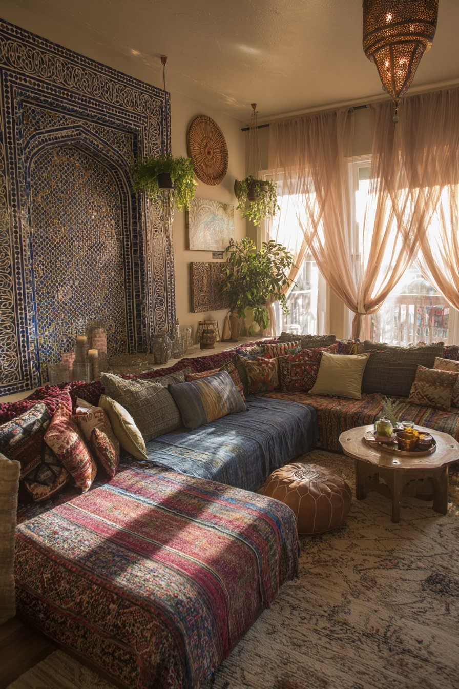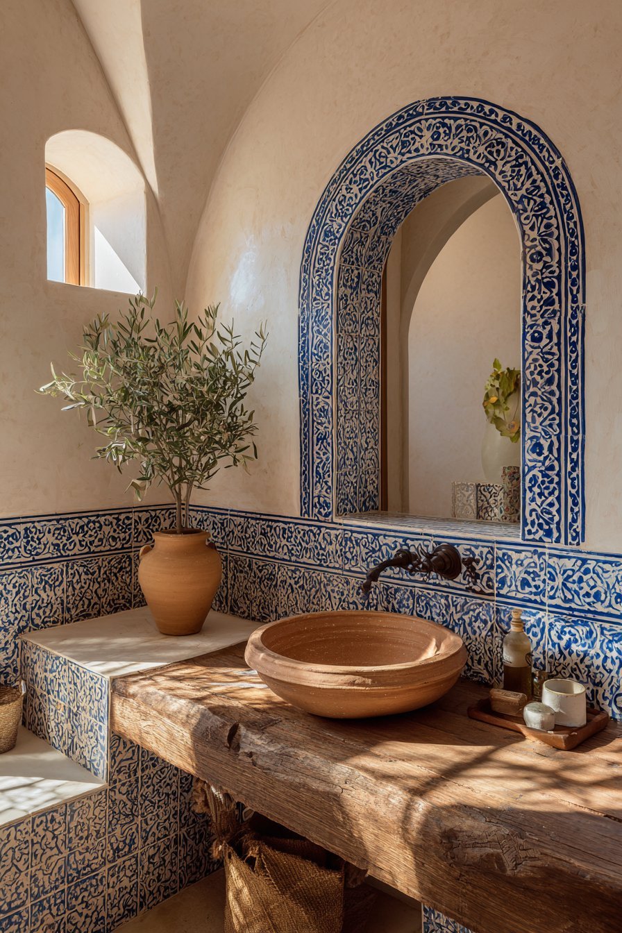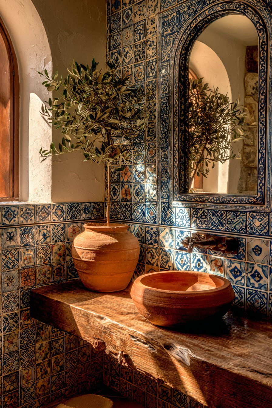 Glazed pottery and olive tree plant enhance regional aesthetic. Warm afternoon light highlights the artisan tile work vibrancy. The cultural craftsmanship adds irreplaceable authenticity. The arched shape references Mediterranean architecture.