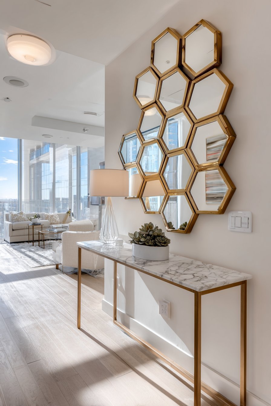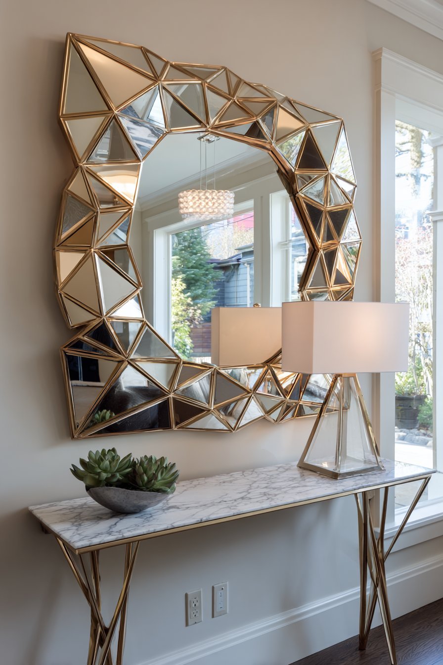 A statement mirror features an irregular geometric brass frame forming honeycomb pattern. The contemporary design hangs above sleek marble console. Gold-finished legs and minimal styling maintain modern aesthetic. White linen lamp shade provides soft illumination.