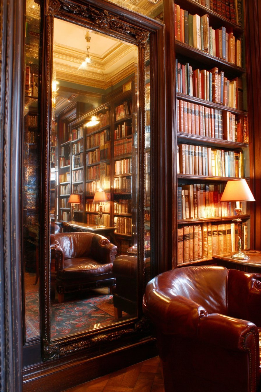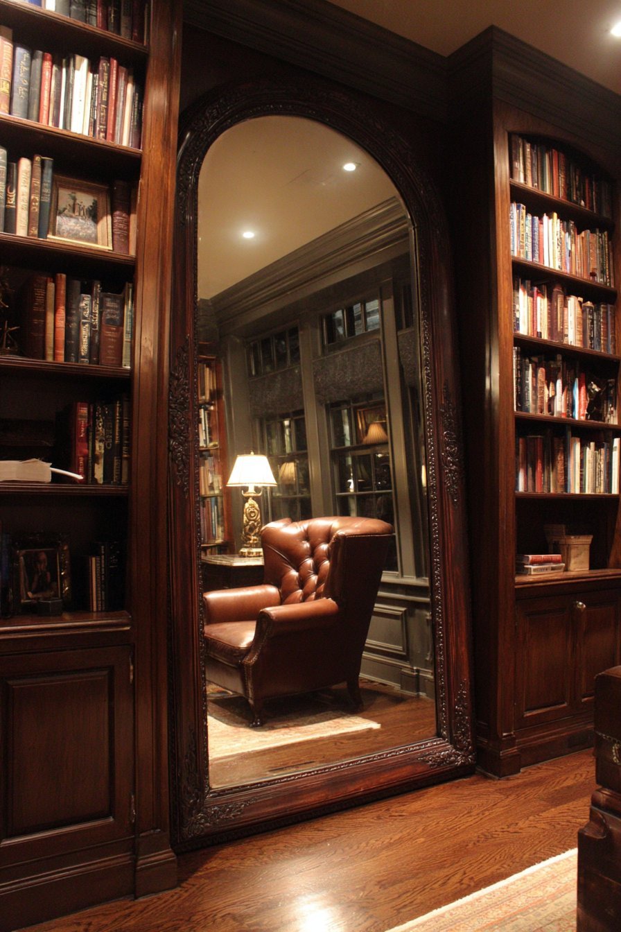 A massive mirror features deep mahogany frame with carved corners. Positioned between floor-to-ceiling bookshelves, it extends library space. Leather wingback chairs and reading lamp appear in reflection. Rich wood tones maintain consistent architectural detail.