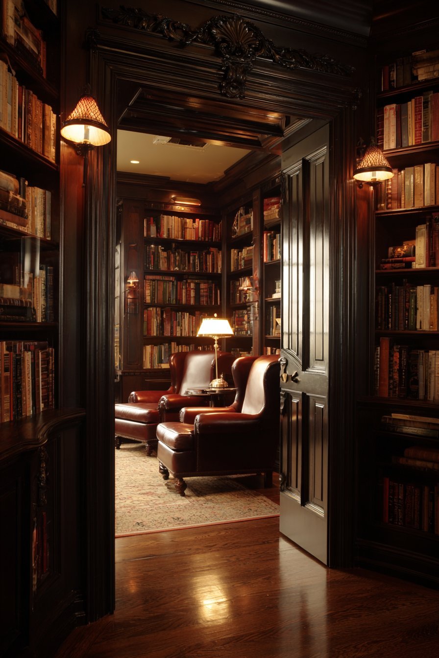 Warm ambient lighting from brass library lamps creates inviting reflections. The substantial scale suits traditional library grandeur. The carved corner details demonstrate fine woodworking. The mirror integrates seamlessly with built-in shelving.