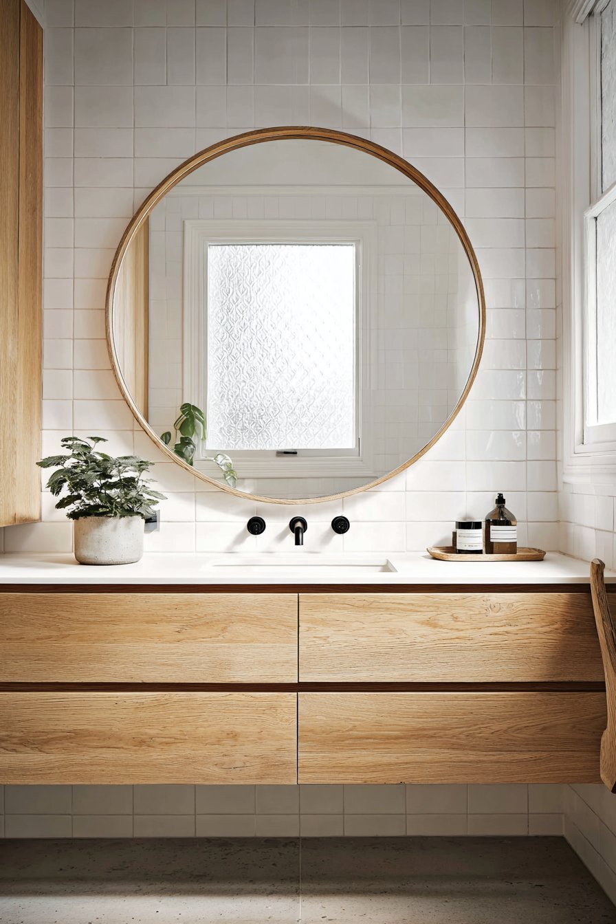 A large round mirror features simple white oak framing. Mounted above wall-mounted floating vanity, it maintains Scandinavian simplicity. The circular design reflects white subway tiles and matte black fixtures. Small potted plant adds natural element.