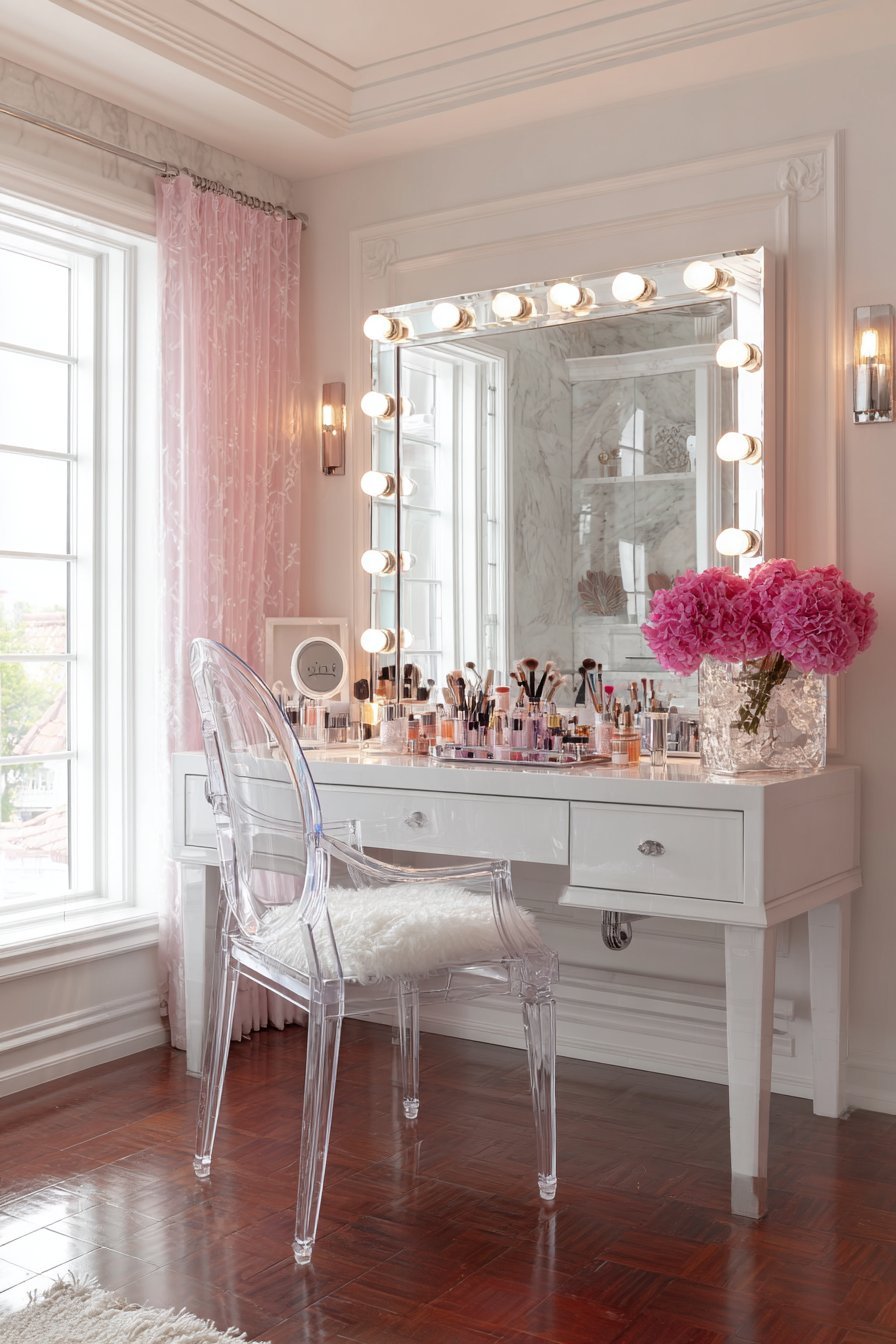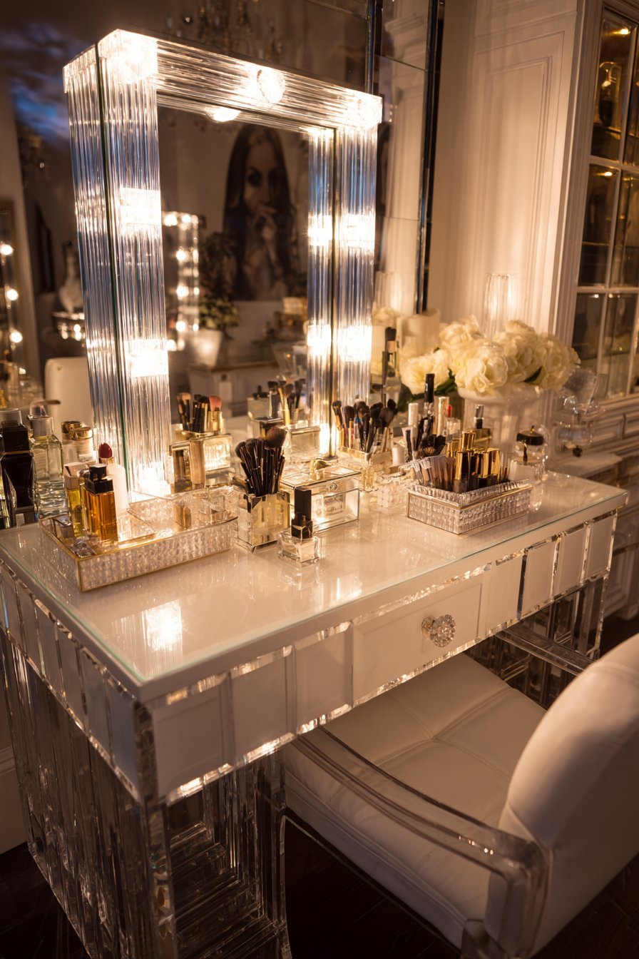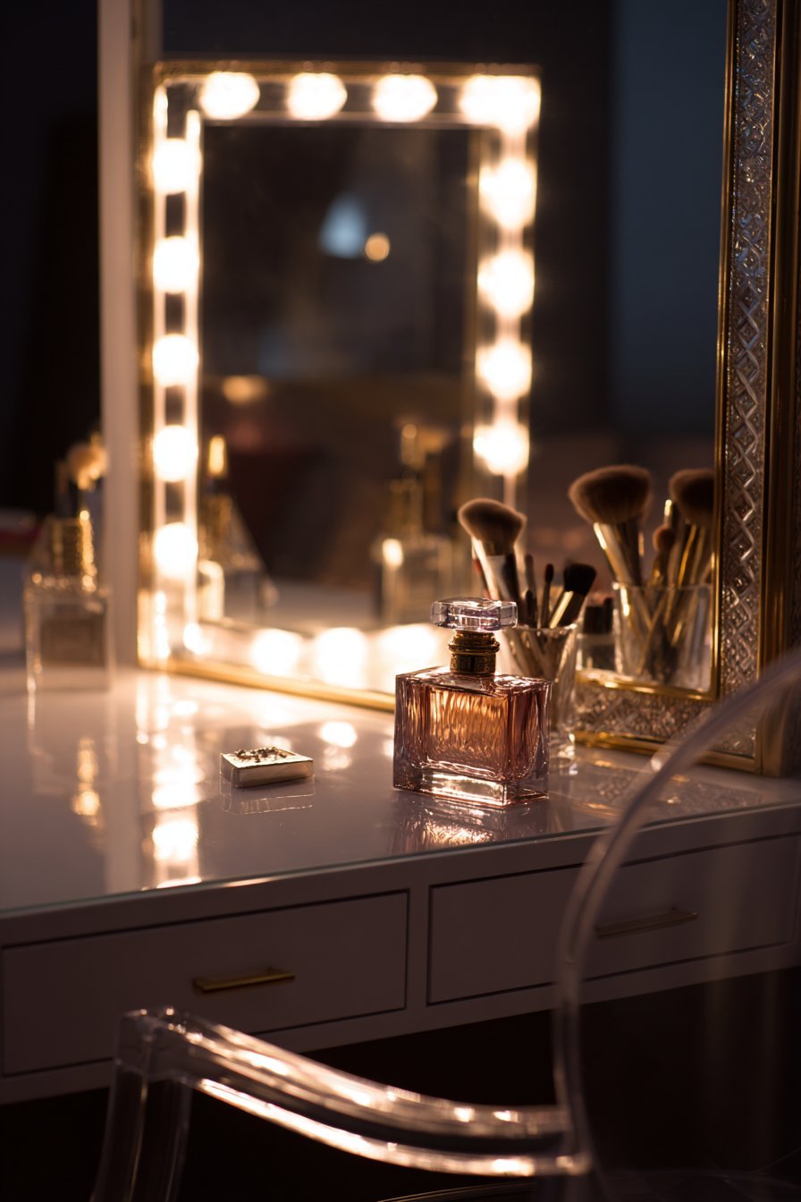 An illuminated mirror features integrated LED bulbs surrounding frame. Classic Hollywood vanity style dominates glamorous dressing room. White lacquer vanity table with lucite chair creates luxury setup. Makeup organization remains neat on glossy surface.