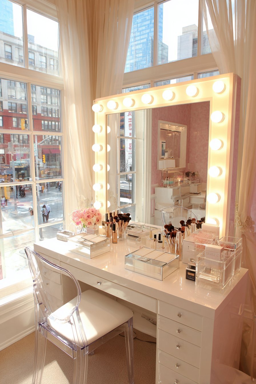 The mirror’s bright even lighting eliminates makeup application shadows. Perfume bottles and jewelry boxes add glamorous styling. The theatrical lighting creates beauty space. The professional-grade illumination serves practical grooming needs.