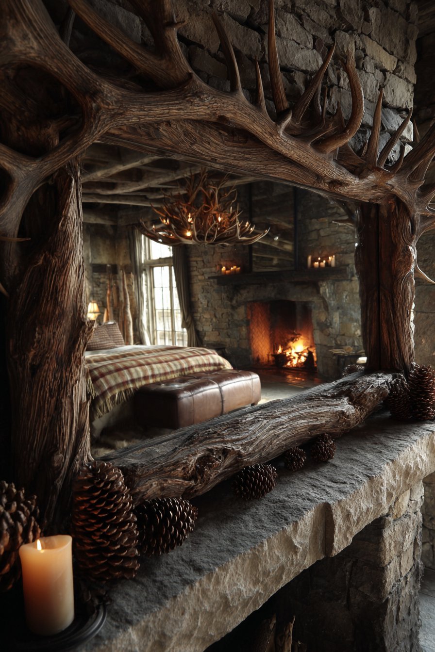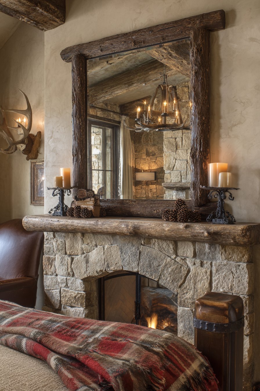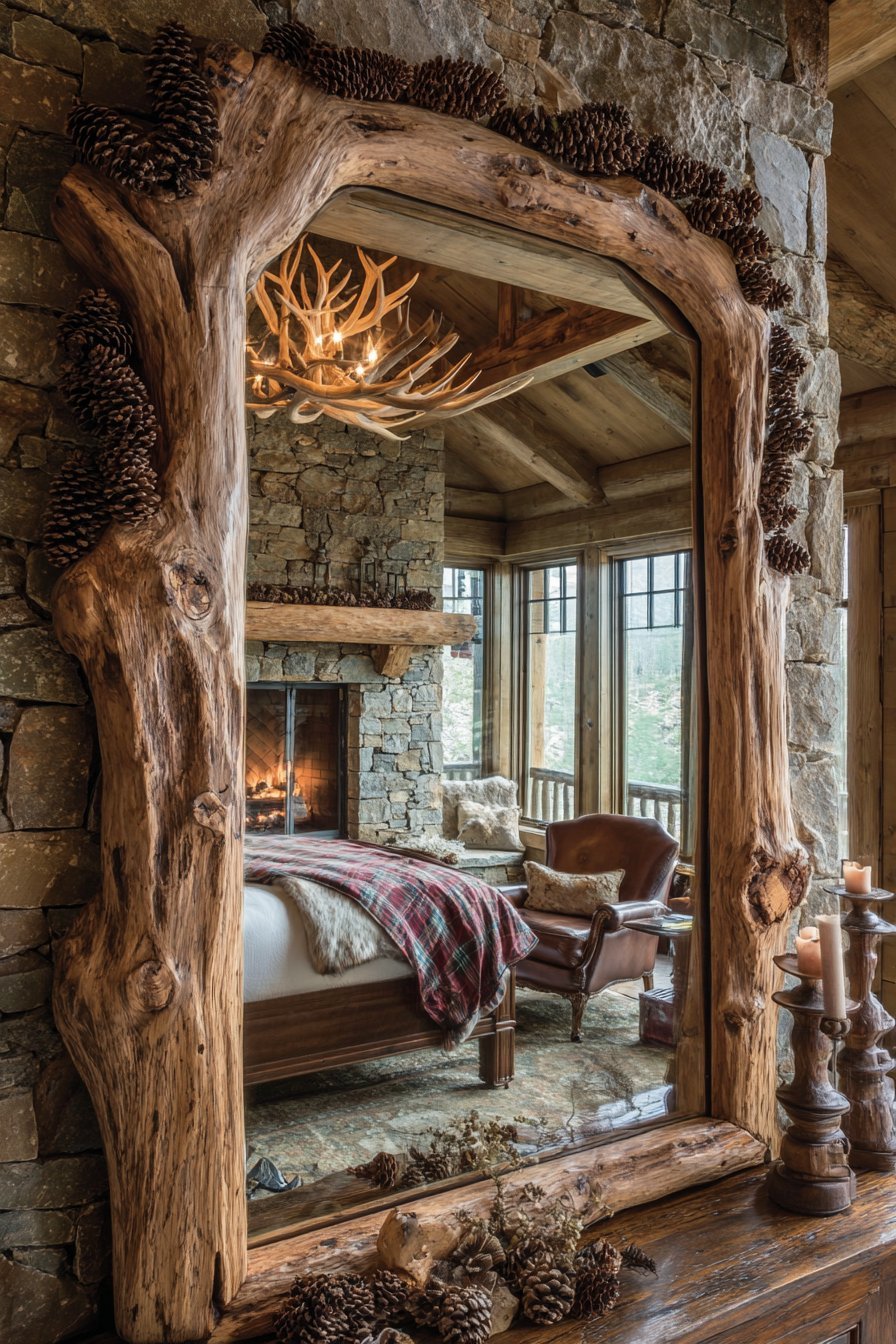 A rustic mirror features rough-hewn log framing with bark edges. Natural wood knots and organic shapes create an authentic lodge aesthetic. The mirror hangs above stone fireplace mantel. Pine cones and iron candle holders complete mountain styling.