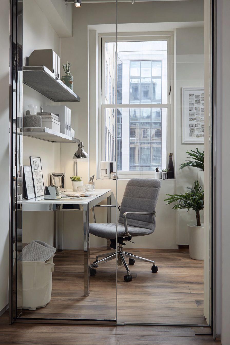 Natural light from nearby window combines with desk lamp. The chrome frame adds professional polish to workspace. The clean lines maintain contemporary office aesthetic. The mirror serves both functional and spatial purposes.