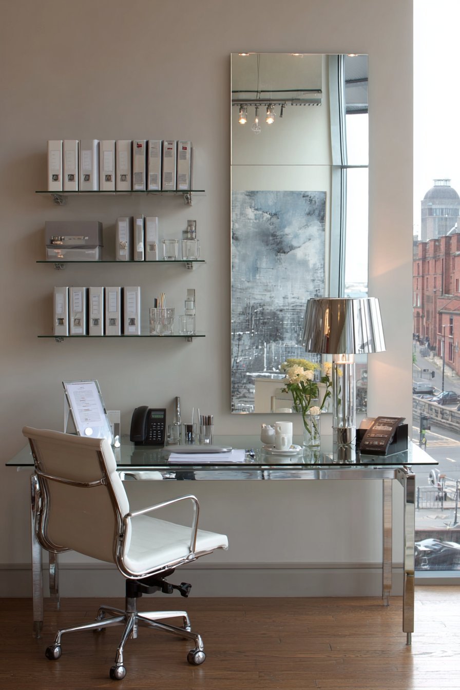 A horizontal mirror features sleek chrome framing behind glass desk. The minimalist design reflects an ergonomic chair and organized shelving. Abstract artwork on the opposite wall appears doubled. The reflection expands compact home office visually.