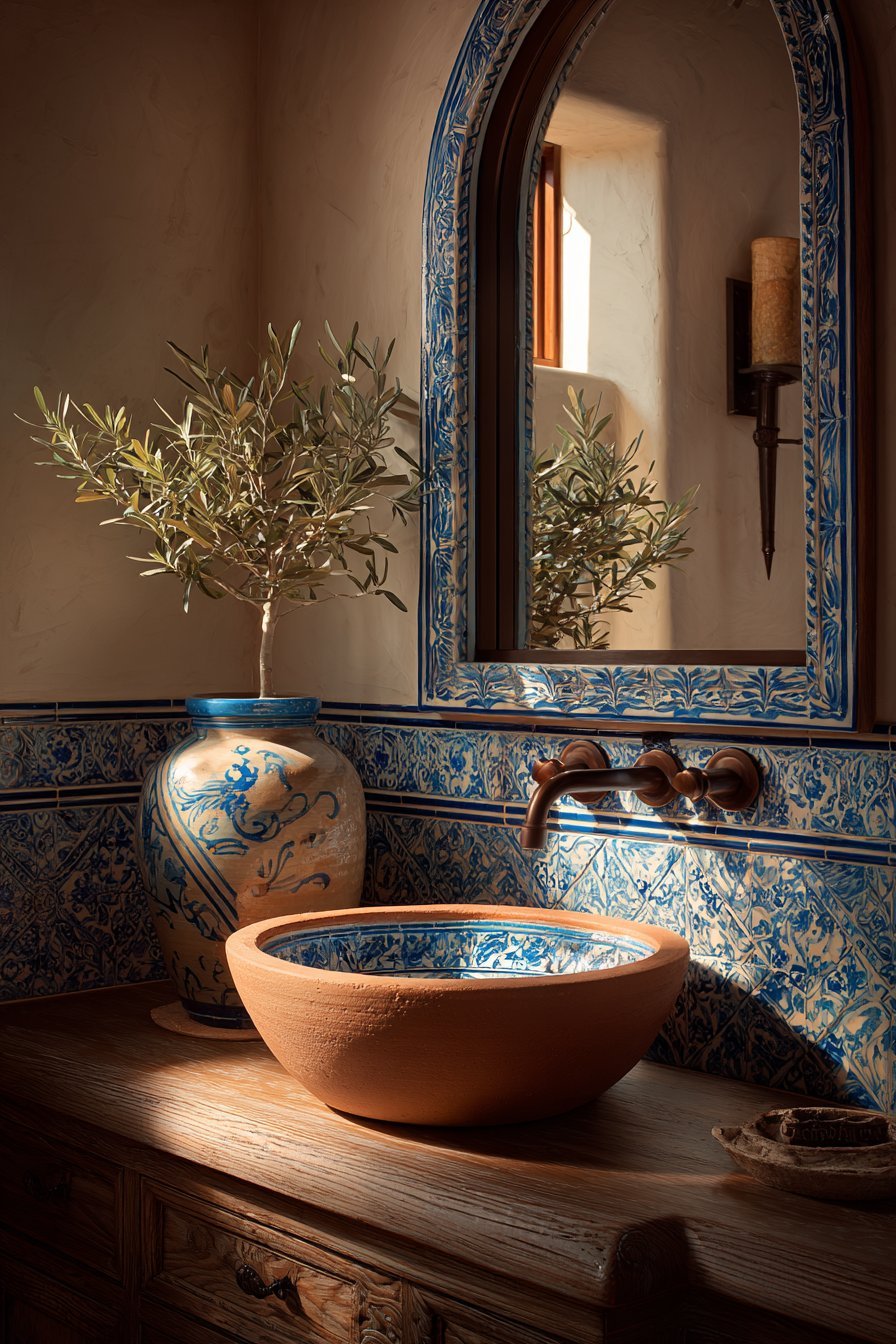 An arched mirror features hand-painted ceramic tile framing. Cobalt blue and white patterns create Mediterranean character. The decorative piece hangs above terra cotta vessel sink. Rustic wooden vanity with wrought iron hardware completes styling.