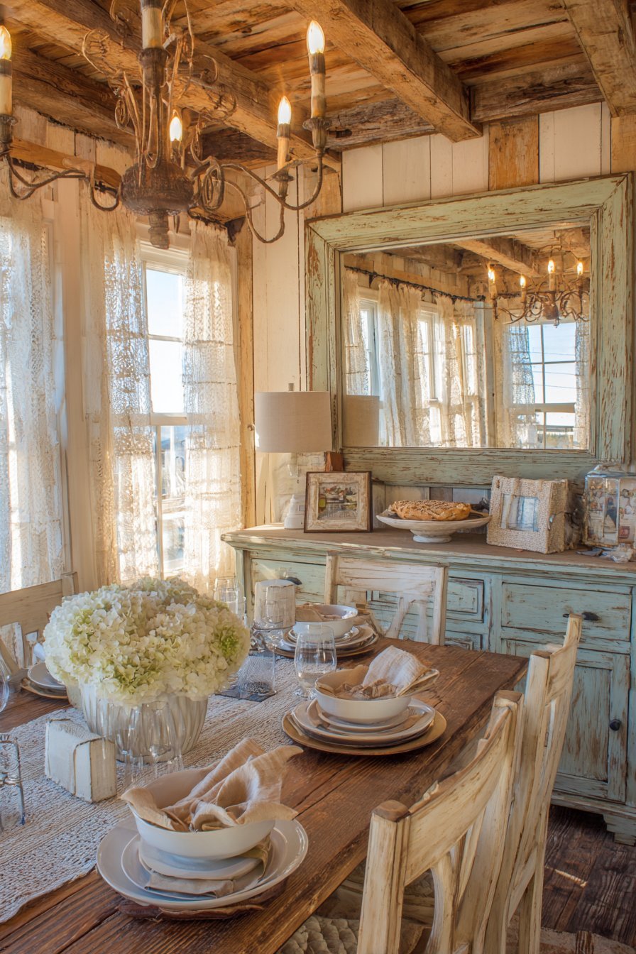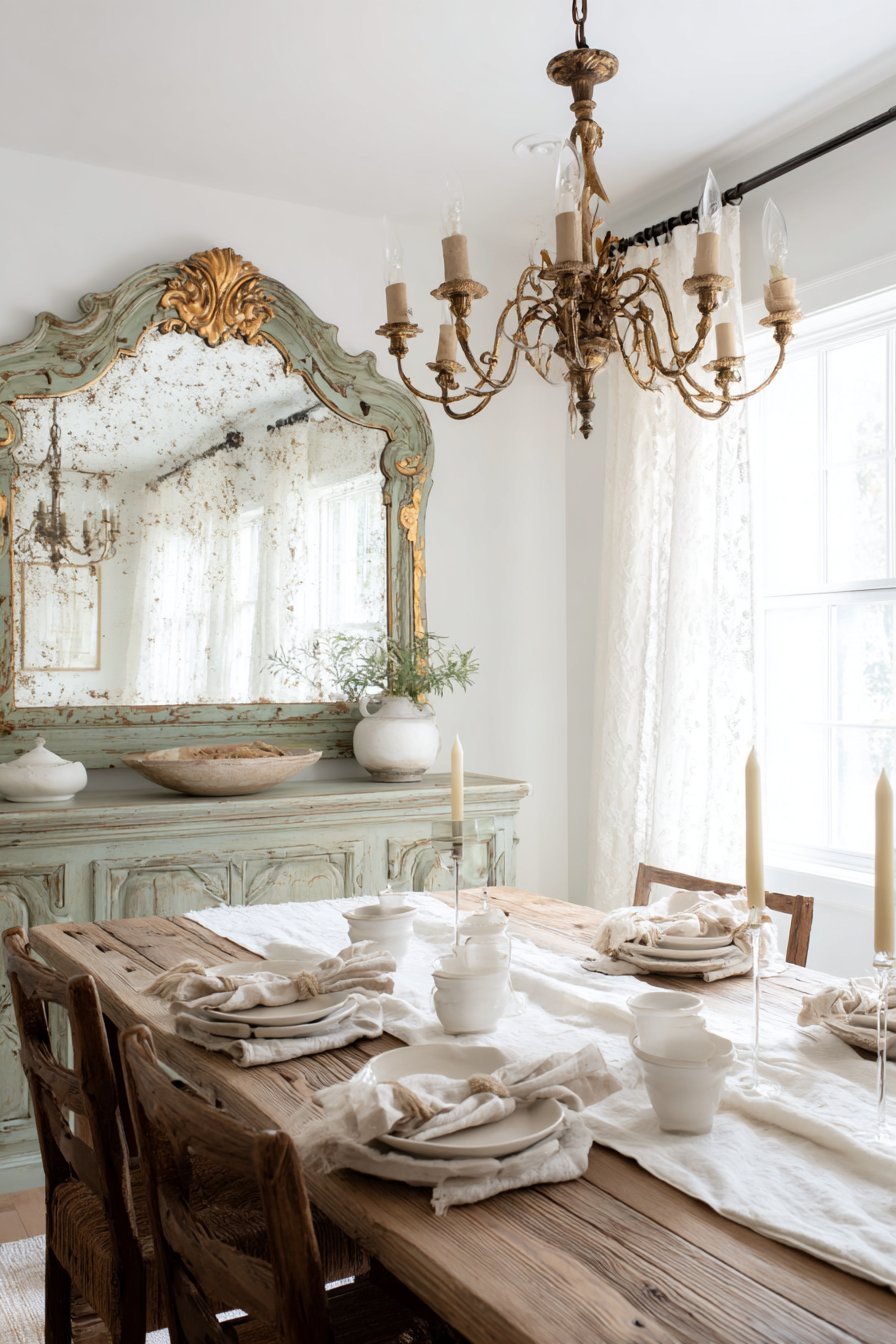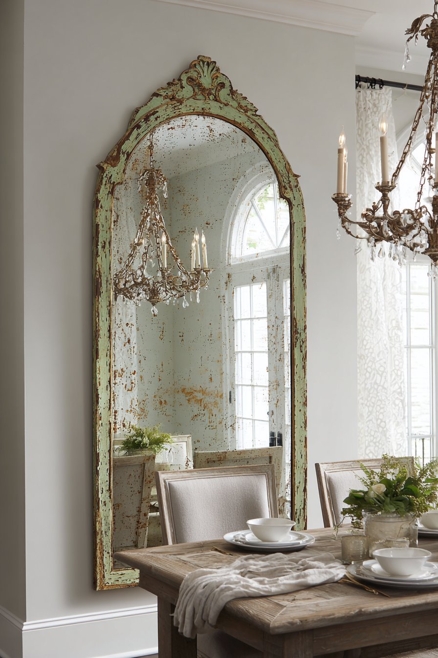 An antique mirror features distressed painted frame in soft sage. Gold undertones show through artful wear patterns. The vintage piece hangs above a weathered farm table. Simple white dinnerware and linen napkins maintain country simplicity.