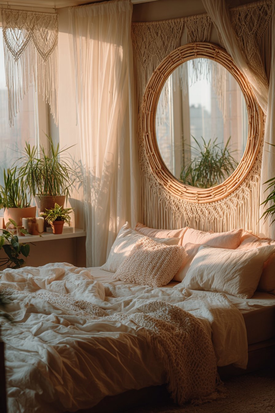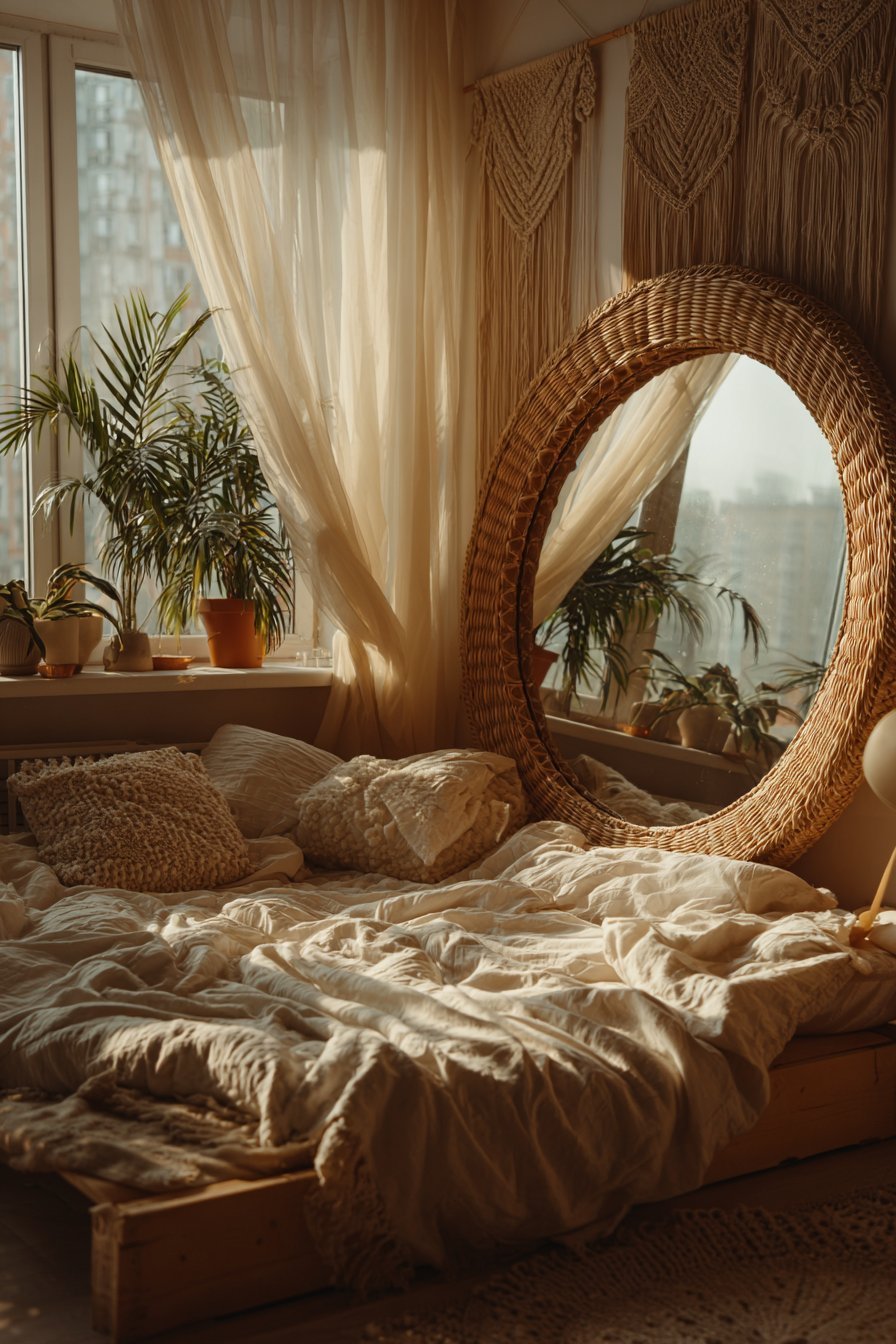 An oversized round mirror features natural rattan framing in organic texture. Positioned above a low platform bed, it anchors bohemian bedroom design. Macramé wall hangings flank the circular shape harmoniously. Potted plants on windowsills appear doubled through reflection.