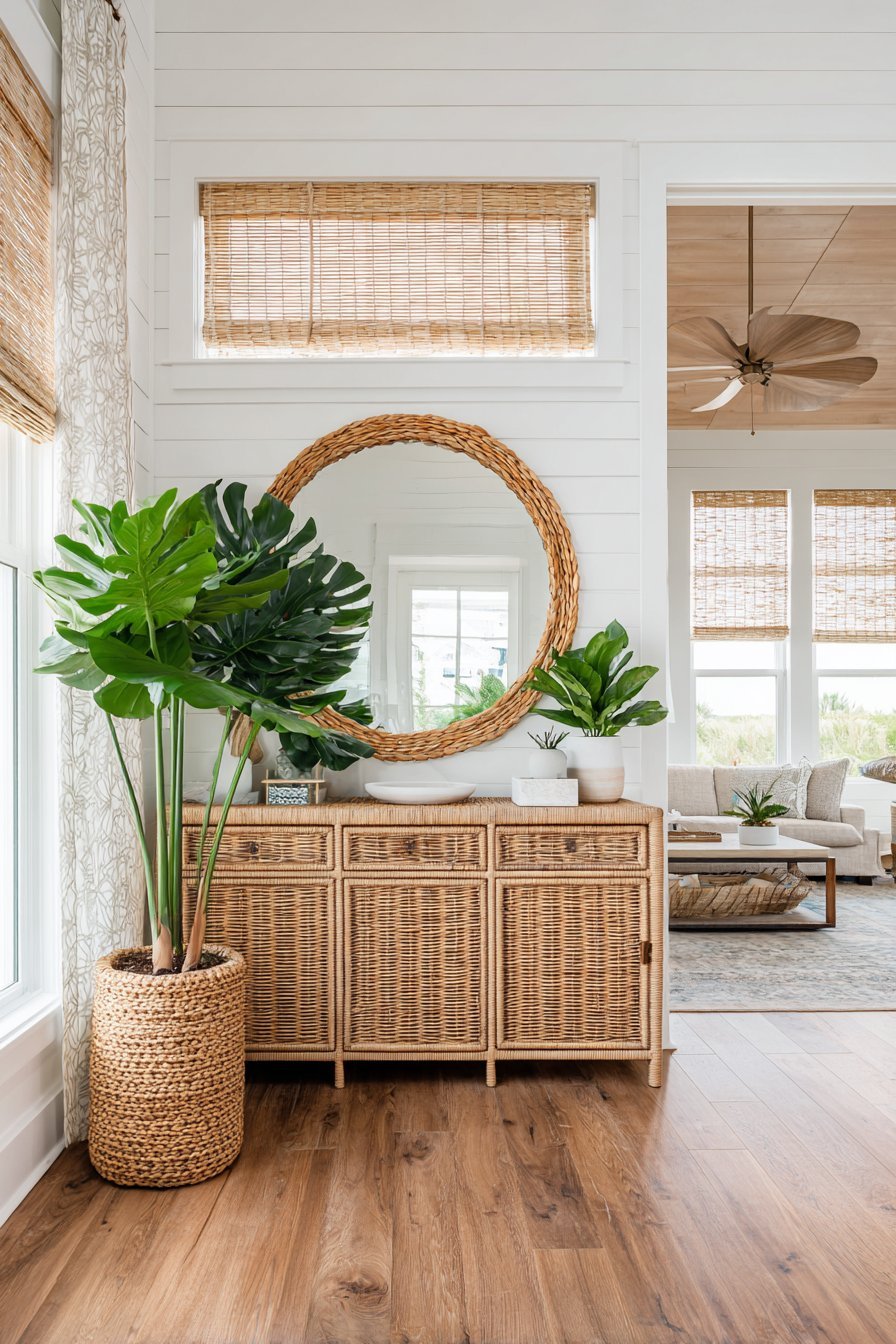 A large oval mirror features wrapped natural rope framing. Thick manila fiber creates an organic tropical texture. The mirror hangs against white shiplap walls. Rattan console table displays potted monstera and bird of paradise.