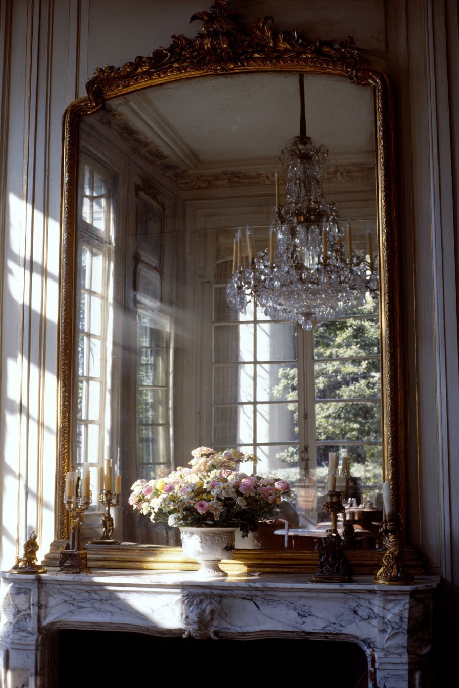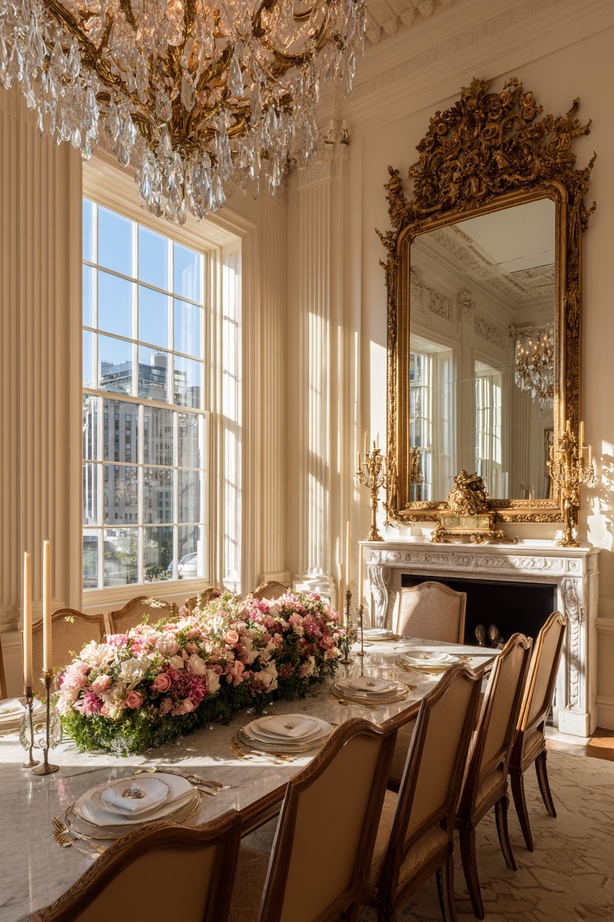 A spectacular ornate mirror with gilded rococo frame dominates above a marble fireplace. The elaborate framing features classical molding details. Crystal chandelier and dining table centerpiece appear doubled through reflection. This creates impressive layered visual depth.