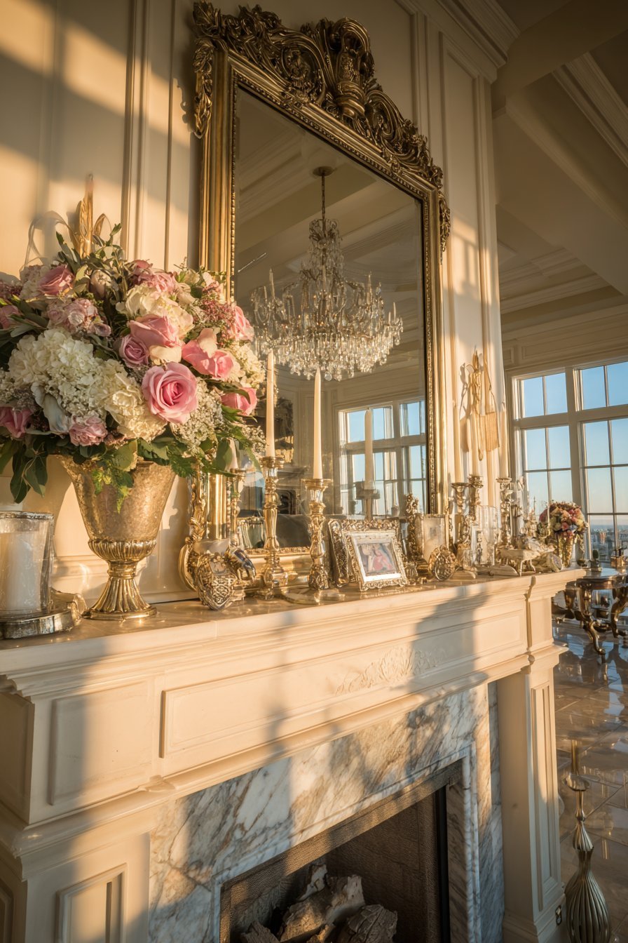 Candlesticks and decorative objects arranged on the mantel complement traditional elegance. Golden hour light streams through tall windows. Warm reflections dance across beveled glass surfaces. The mirror commands presence through scale and decorative artistry.