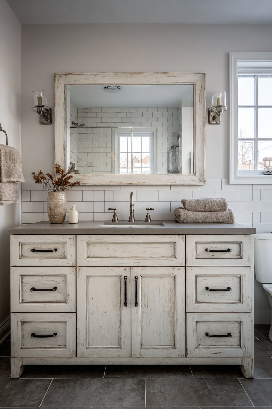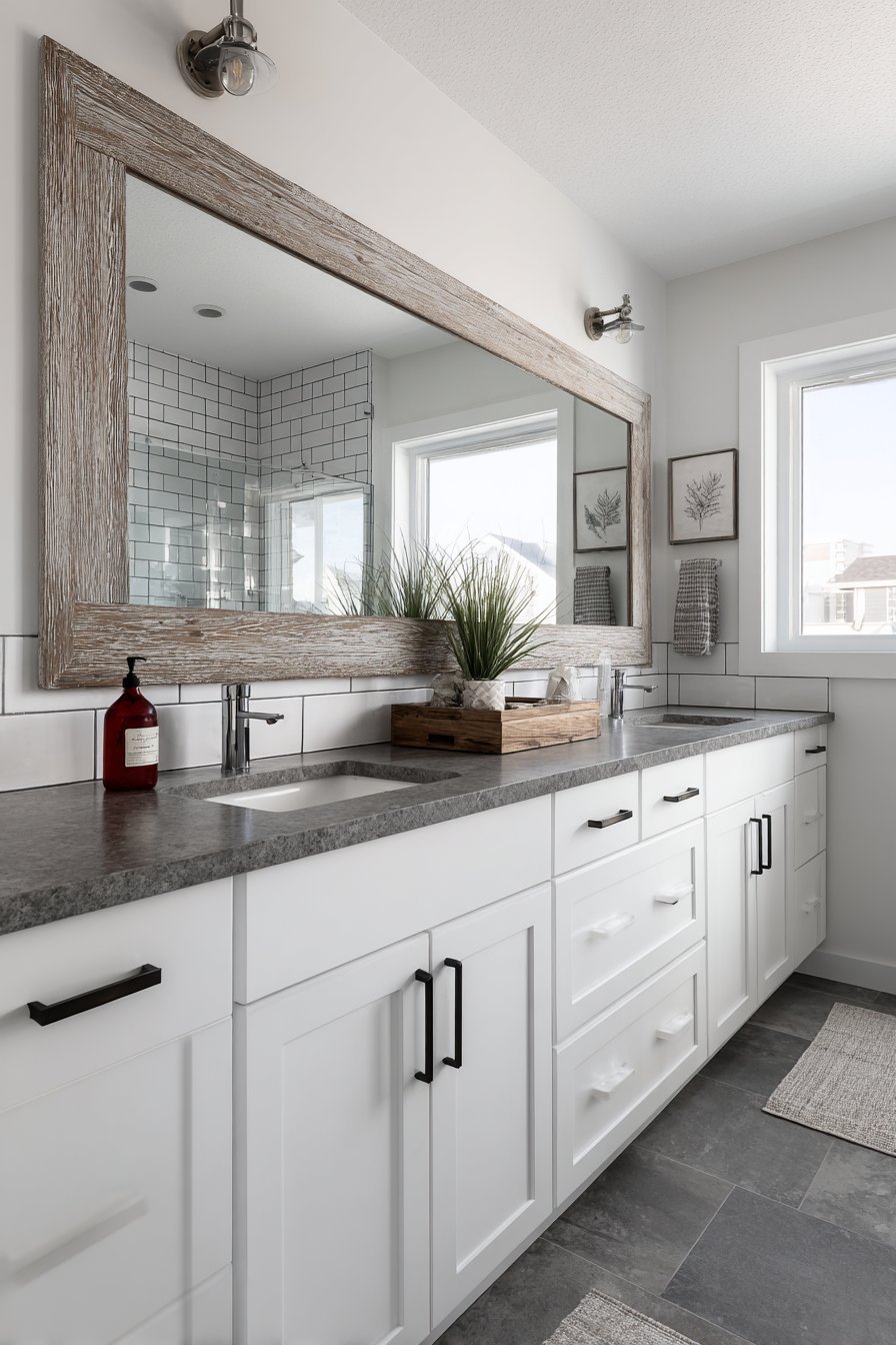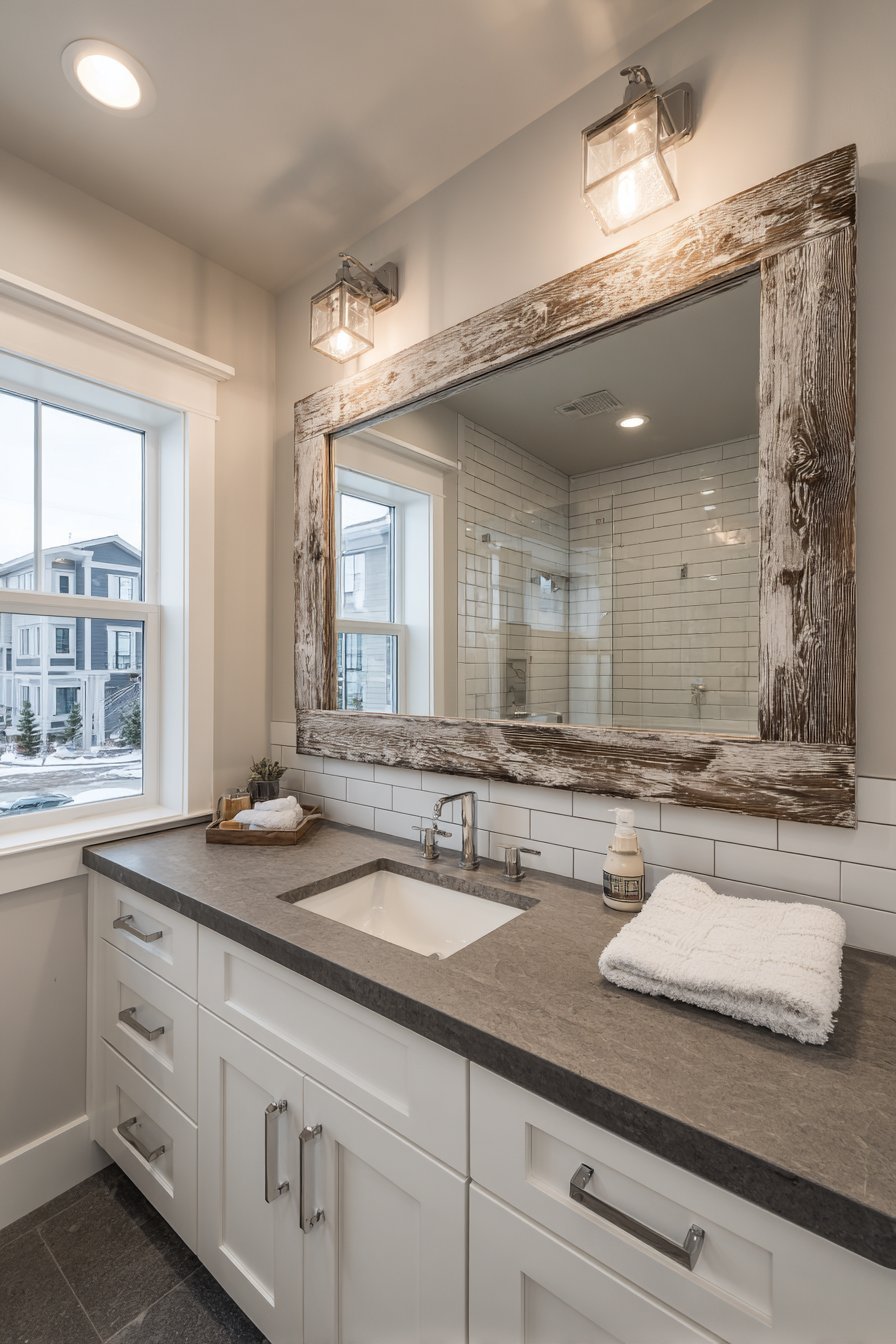 Cotton hand towels and ceramic soap dispensers provide practical styling. Grey quartz countertops balance white cabinetry beautifully. Soft natural light from frosted windows illuminates without harsh glare. The rustic frame texture contrasts smooth contemporary surfaces.