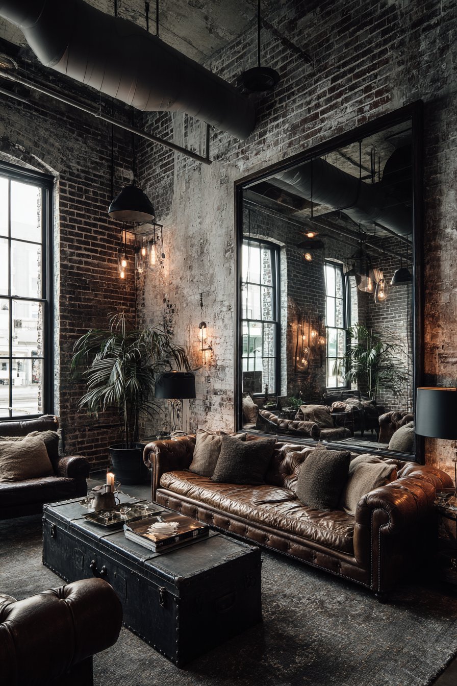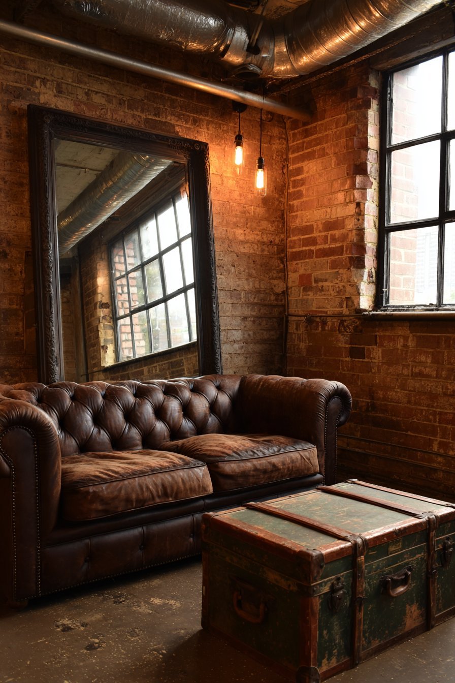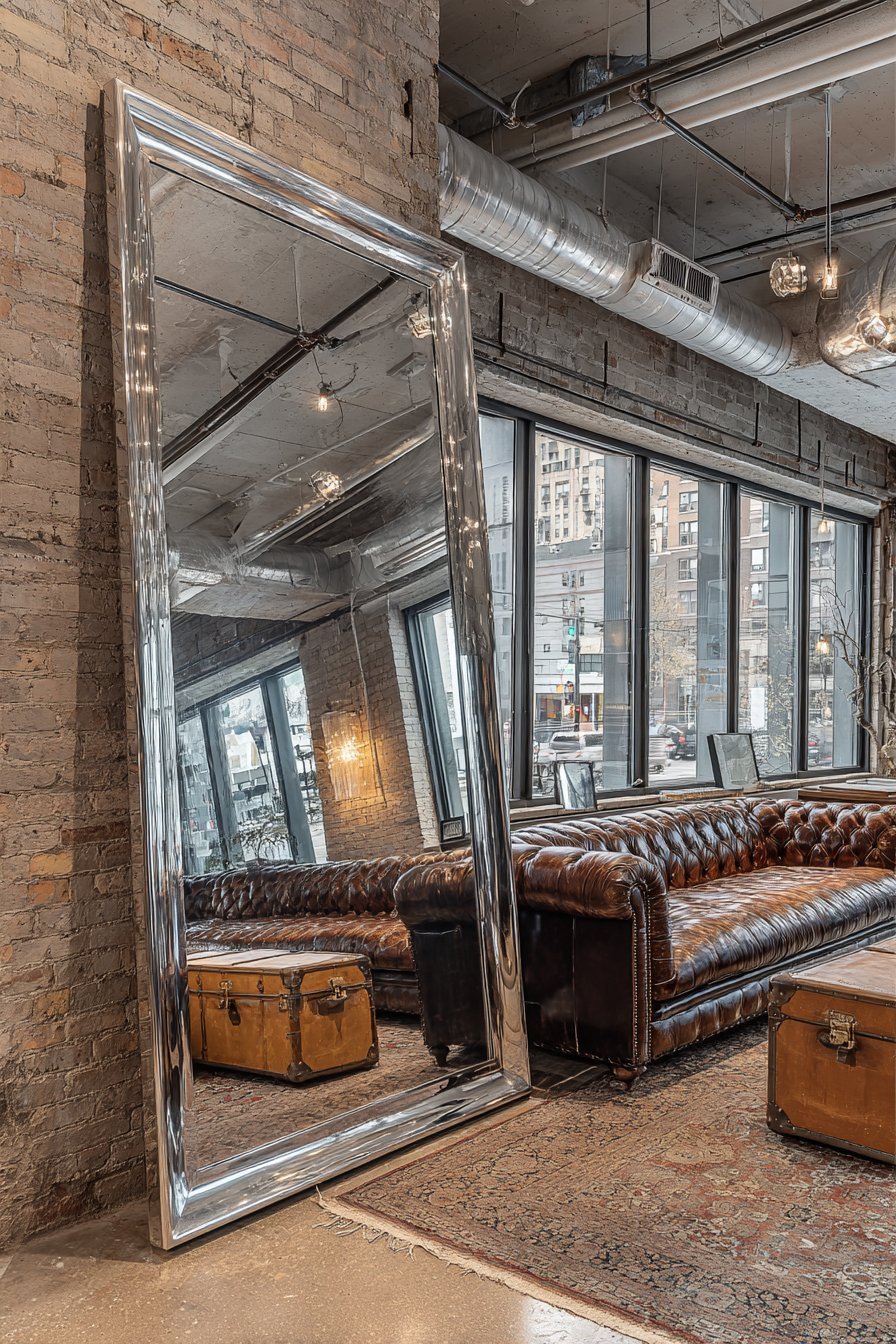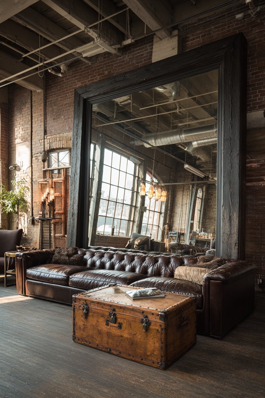 A worn leather Chesterfield sofa and vintage trunk coffee table sit prominently. The mirror dramatically expands perceived room volume. Diffused natural light from factory-style windows creates atmospheric effects. The steel frame develops natural oxidation over time.