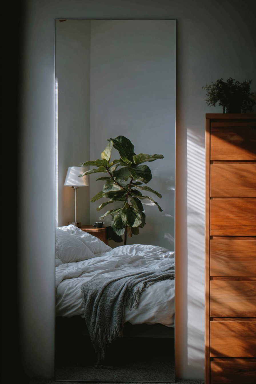 Small potted fiddle leaf fig and modern lamp appear in reflection. Morning sunlight creates gentle highlights along beveled edges. The seamless integration exemplifies Scandinavian design principles. Uncluttered aesthetic promotes serene bedroom environments.