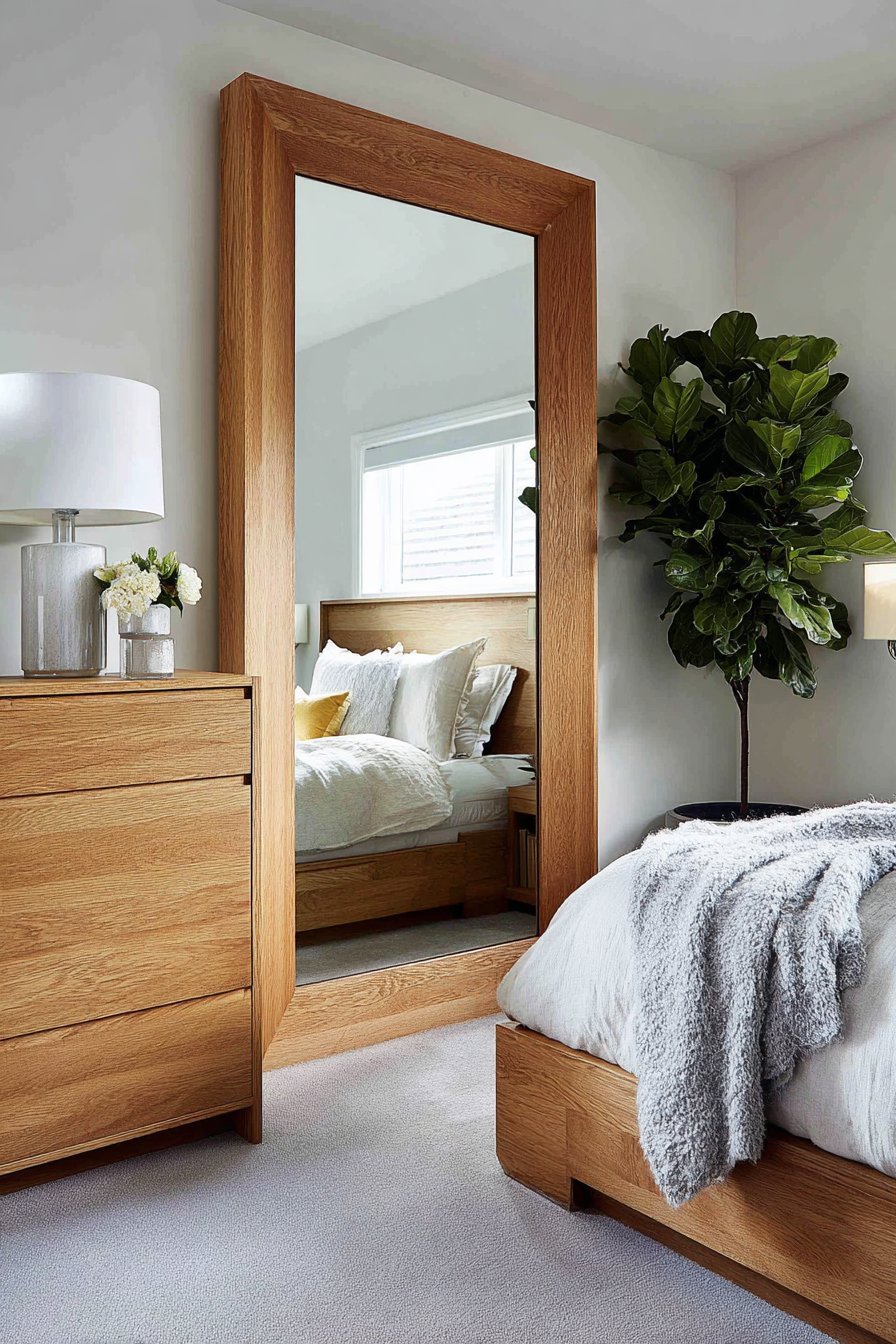 A frameless mirror features elegant beveled edges creating subtle definition. Mounted full-length on bedroom walls, it serves functional purposes. Simple white oak dresser sits adjacent to clean design. Natural linen bedding and grey wool throw maintain a minimalist palette.