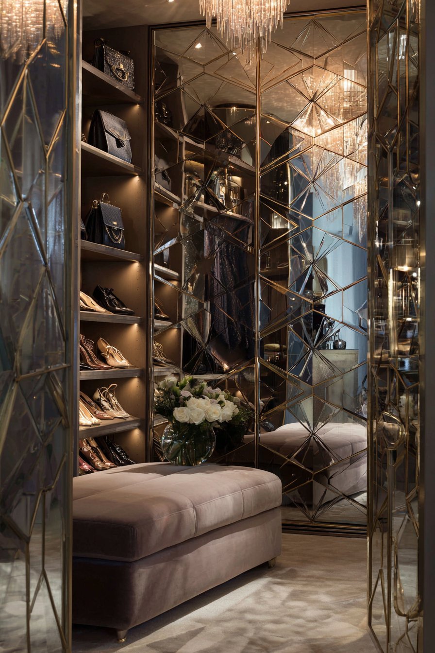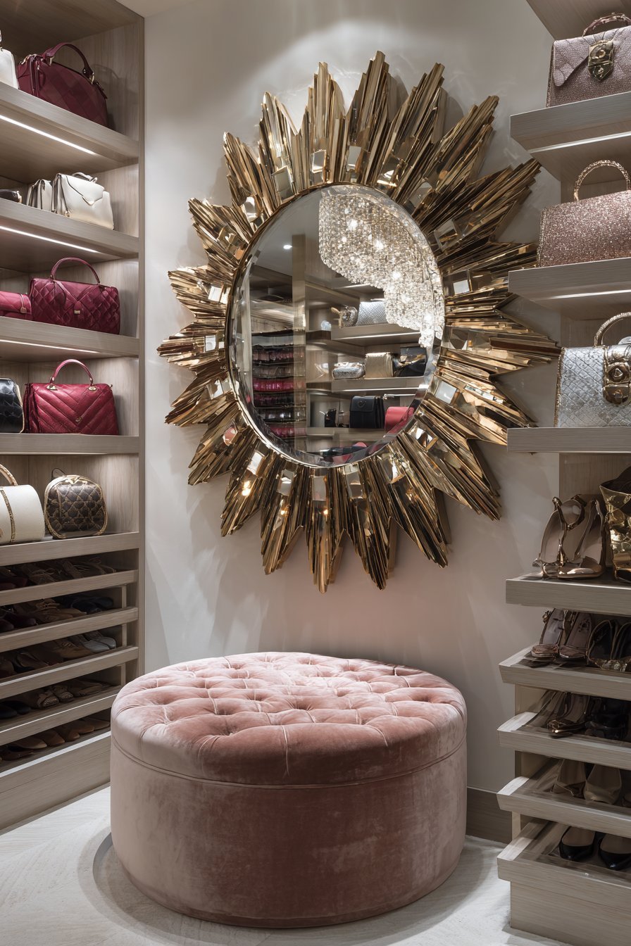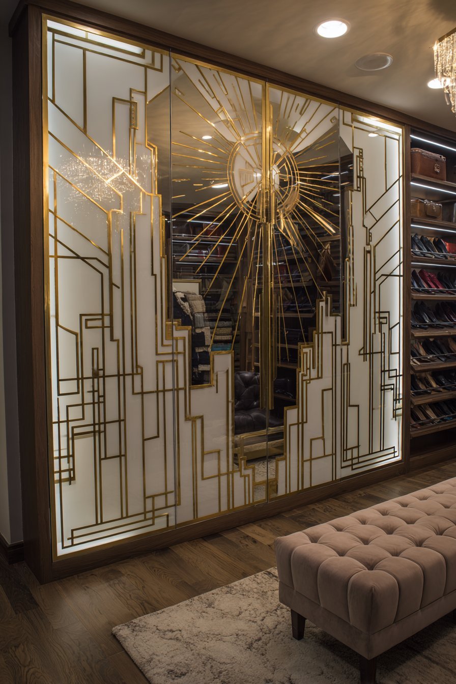 A glamorous mirror features geometric brass inlay forming honeycomb patterns. Sunburst design elements add Art Deco distinction. The statement piece dominates walk-in closet walls. Organized shelving displaying accessories appears doubled through reflection.