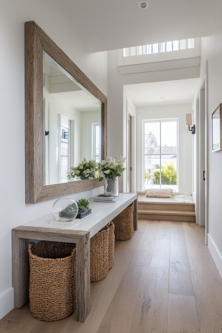 Natural light from nearby windows reflects throughout narrow entry spaces. The organic frame texture brings seaside atmosphere indoors. Weathered grey tones complement whitewashed furniture beautifully. The mirror brightens challenging entry areas effectively.