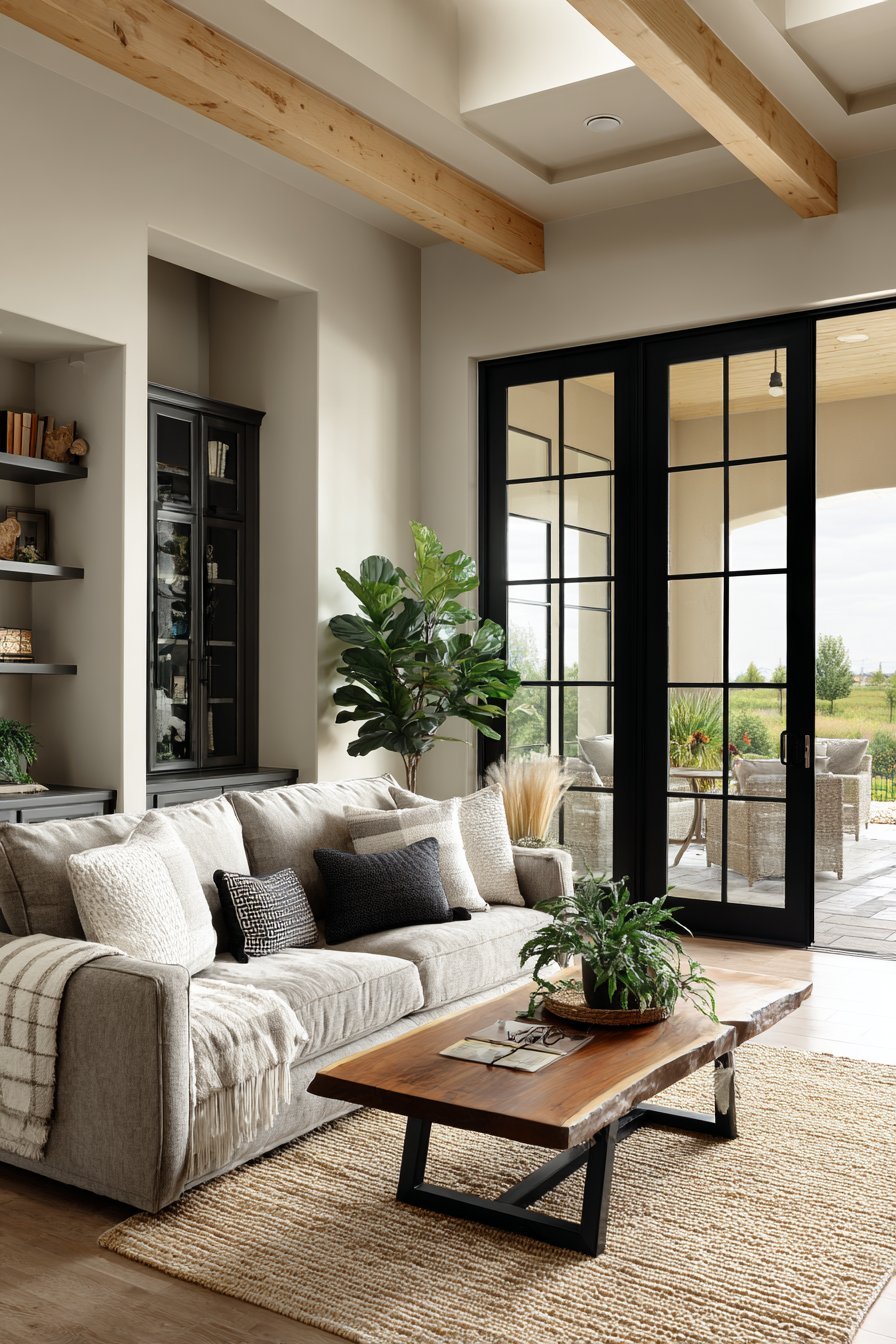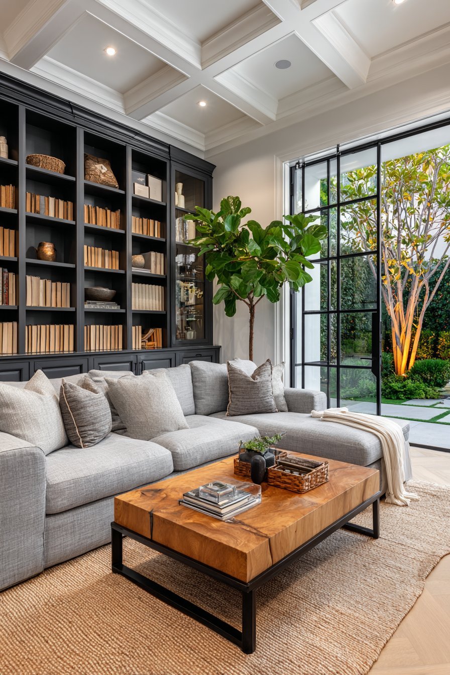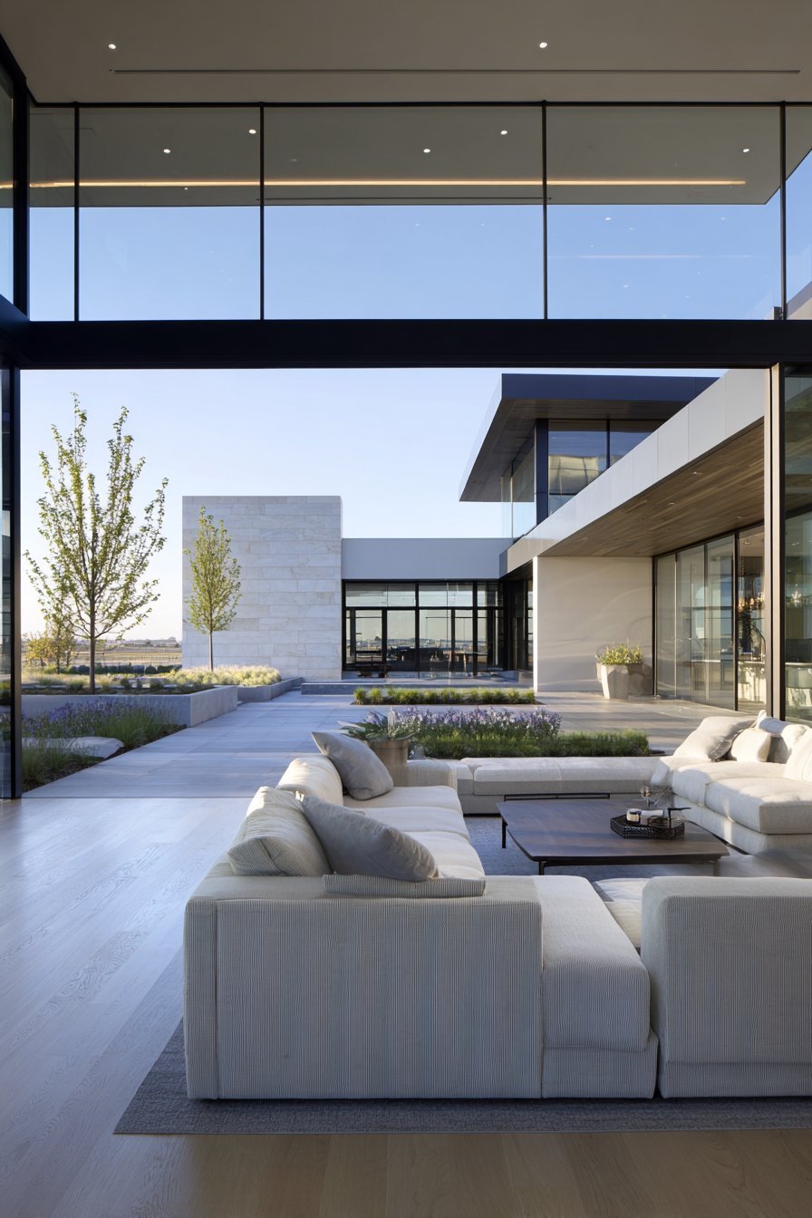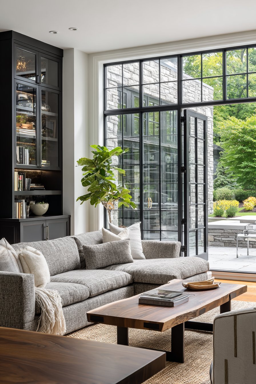 The seamless transition extends through matching flooring materials. Light oak planks continue from living room to exterior deck without interruption. This visual trick expands perceived square footage significantly. A neutral linen sectional faces the glass wall, oriented to capture garden views. The low-profile coffee table preserves sightlines to the landscape beyond.