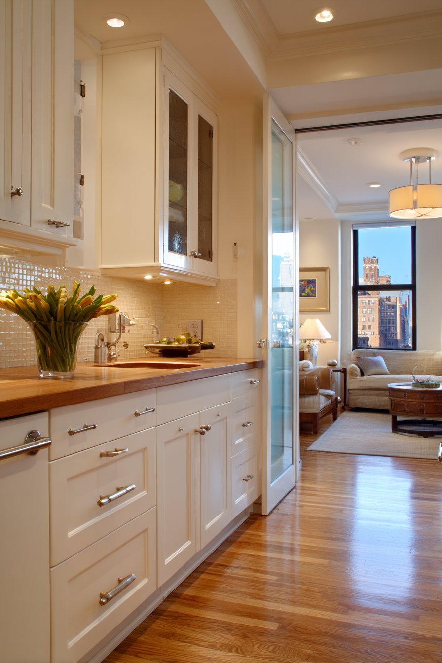 This design approach balances openness with traditional kitchen styling. The transparency lightens what might otherwise feel heavy with solid doors. Carefully curated dish collections become part of the decorative scheme. The glass reflects light throughout the kitchen, brightening the entire workspace. This creates an airy feel even in smaller kitchen footprints.