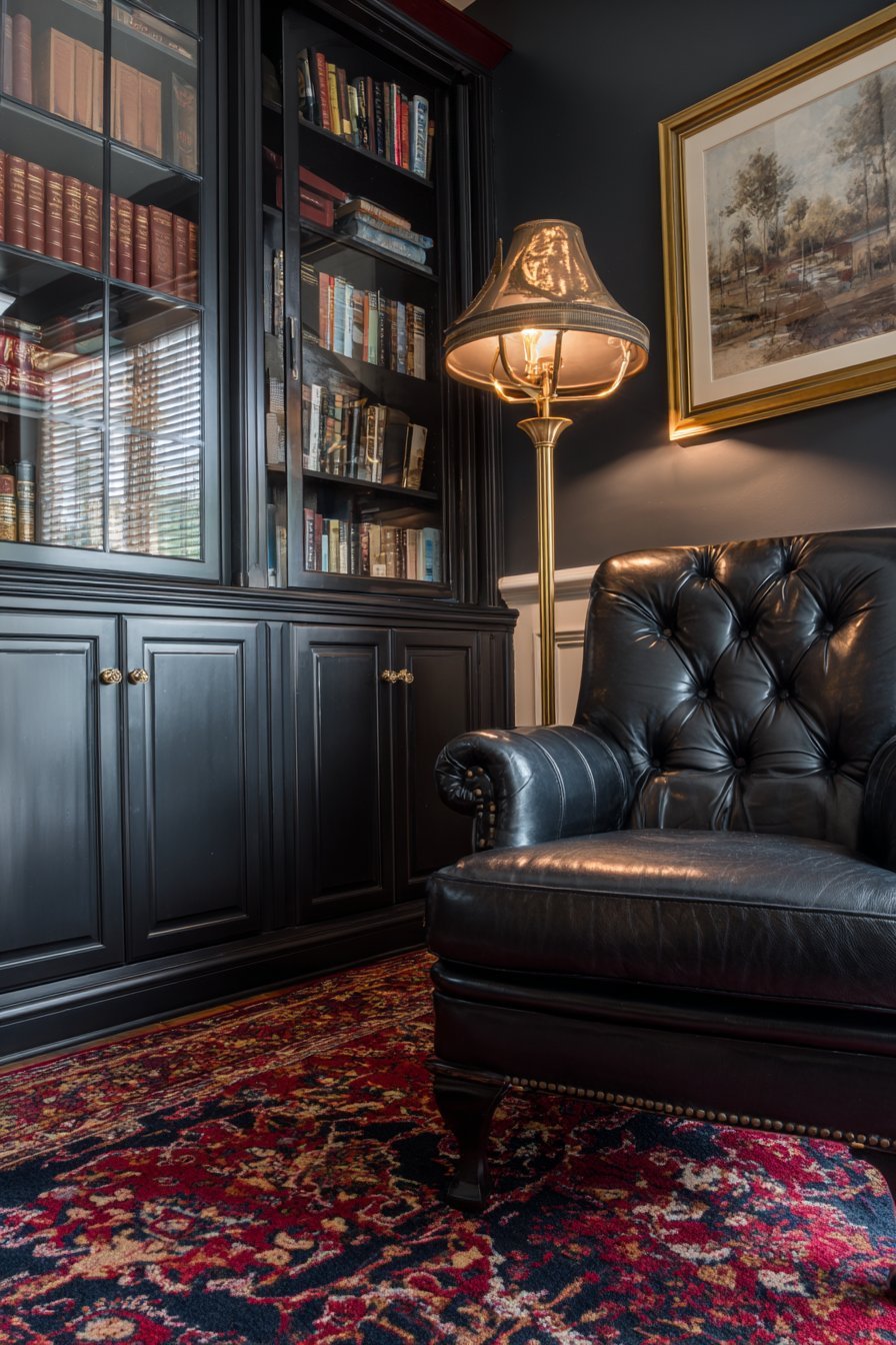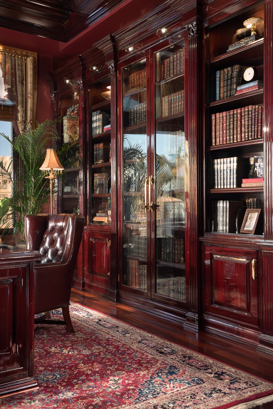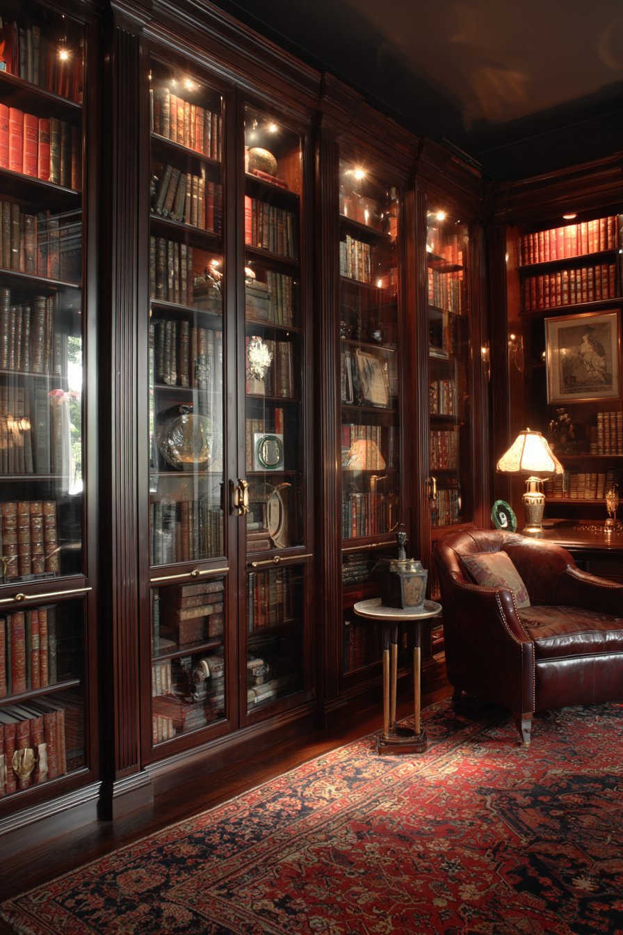 Oriental rug in deep reds and blues anchors the scholarly space. Warm ambient lighting reflects on glass surfaces creating inviting glow. The glass protection prevents dust accumulation on first-edition collections. Visual access allows appreciating leather-bound volumes without removing them. This design celebrates knowledge and literary pursuits.