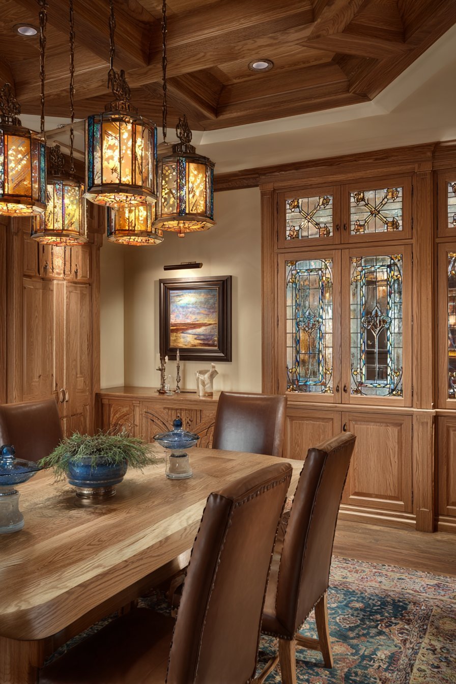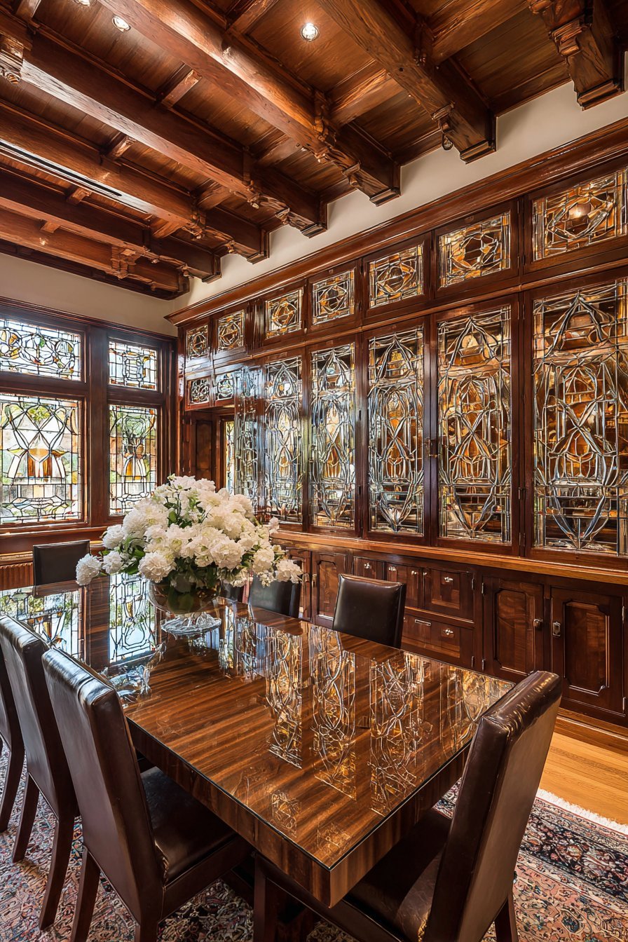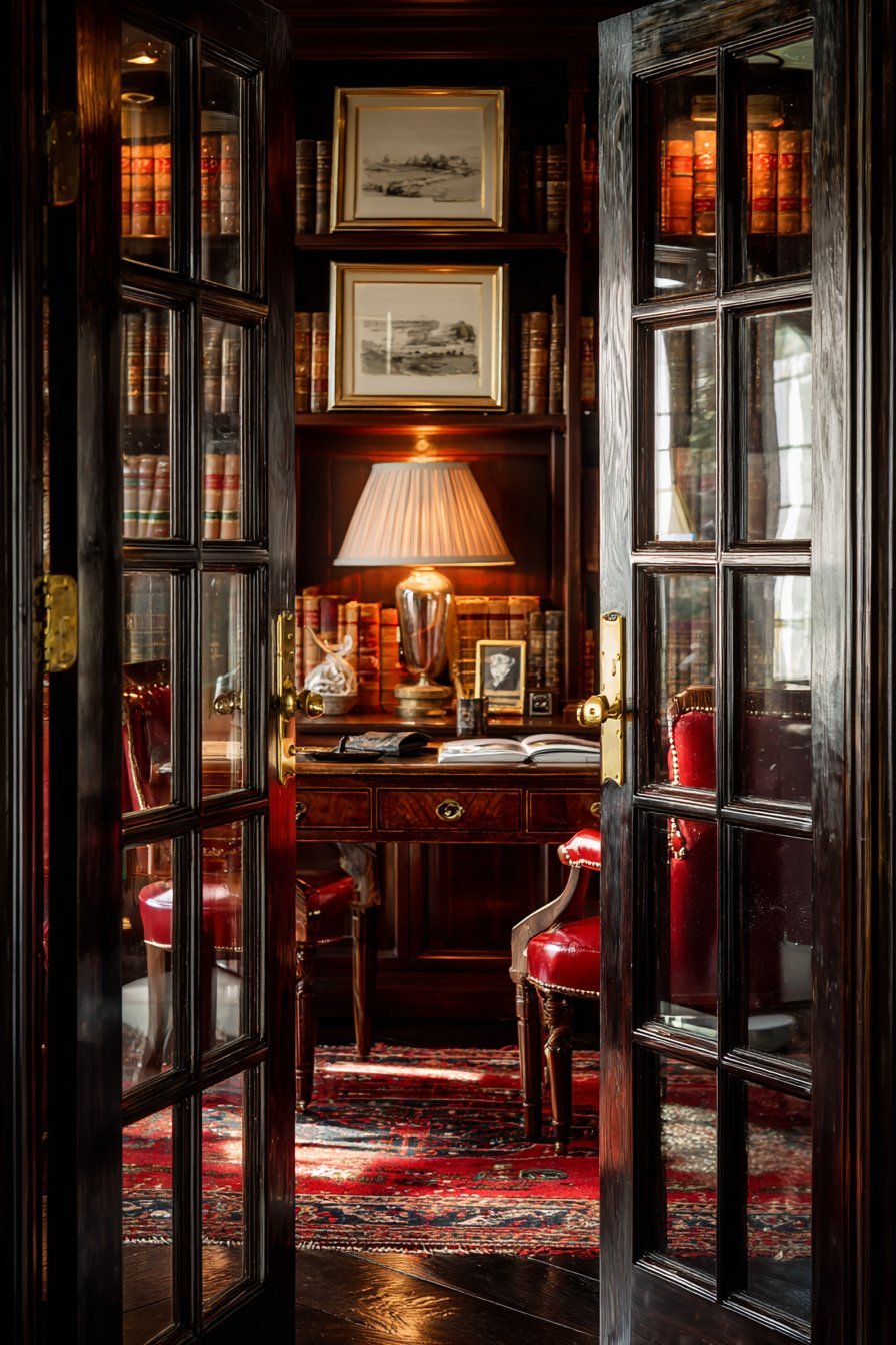 Oriental rug in deep reds and blues anchors the scholarly space. Warm ambient lighting reflects on glass surfaces creating inviting glow. The glass protection prevents dust accumulation on first-edition collections. Visual access allows appreciating leather-bound volumes without removing them. This design celebrates knowledge and literary pursuits.
