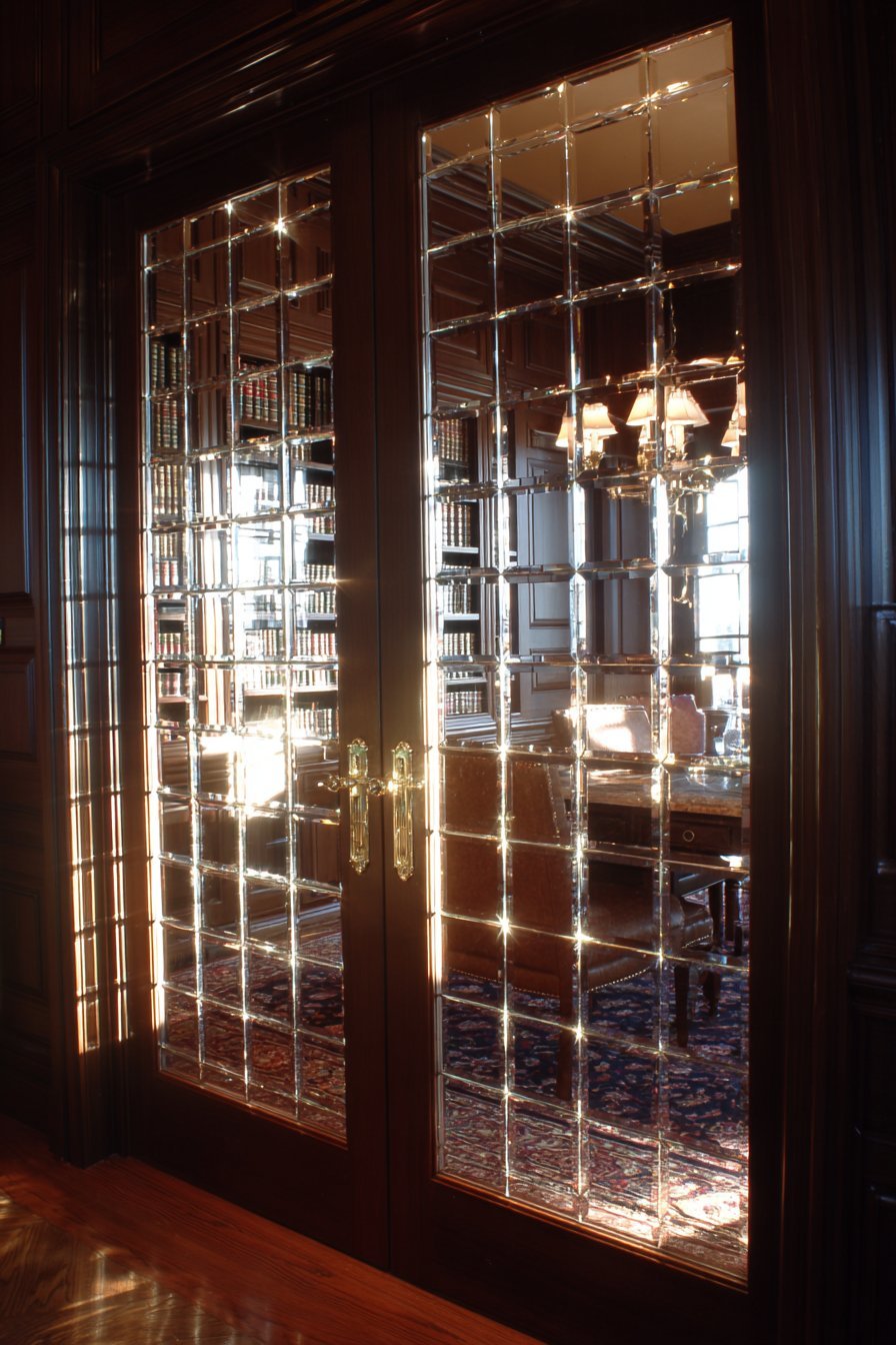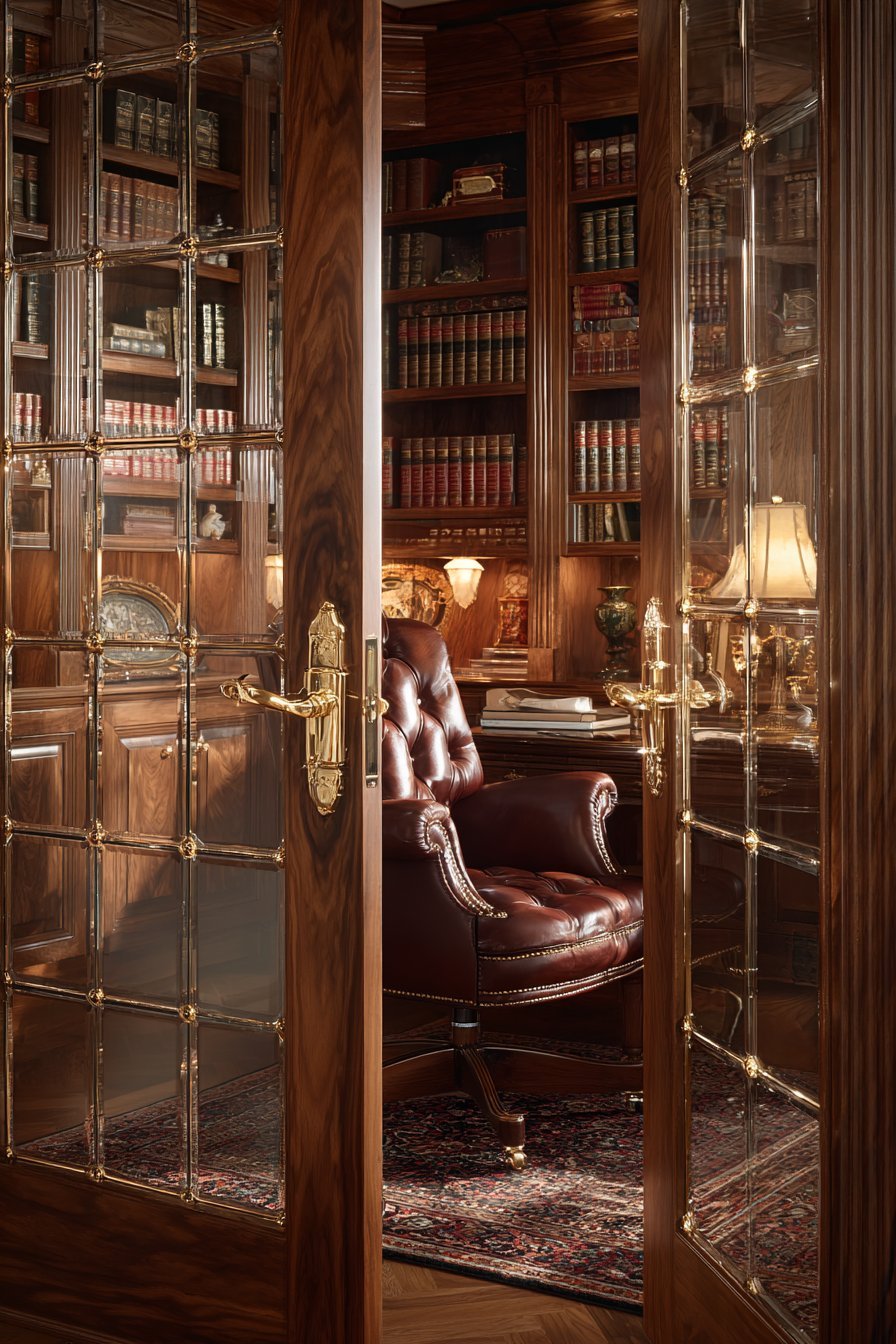Classic glass-paned bookcase doors protect valuable book collections. Dark cherry wood frames with antique brass hardware suit traditional libraries. Built-in floor-to-ceiling bookcases with glass doors line complete wall. Leather reading chair and standing lamp create dedicated reading corner.
