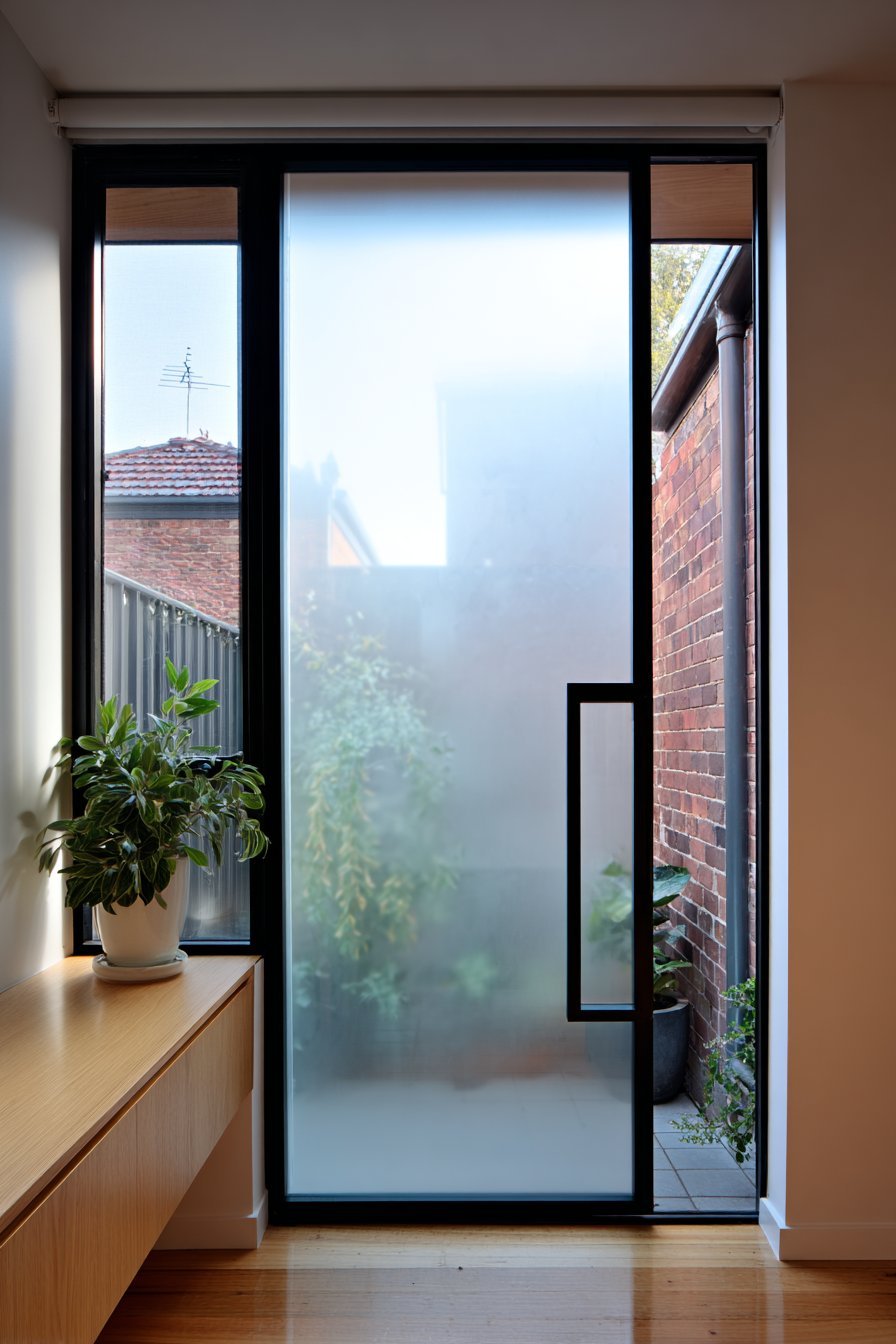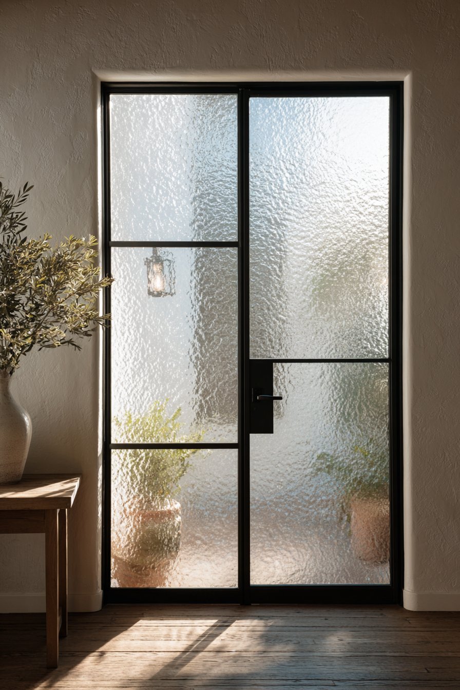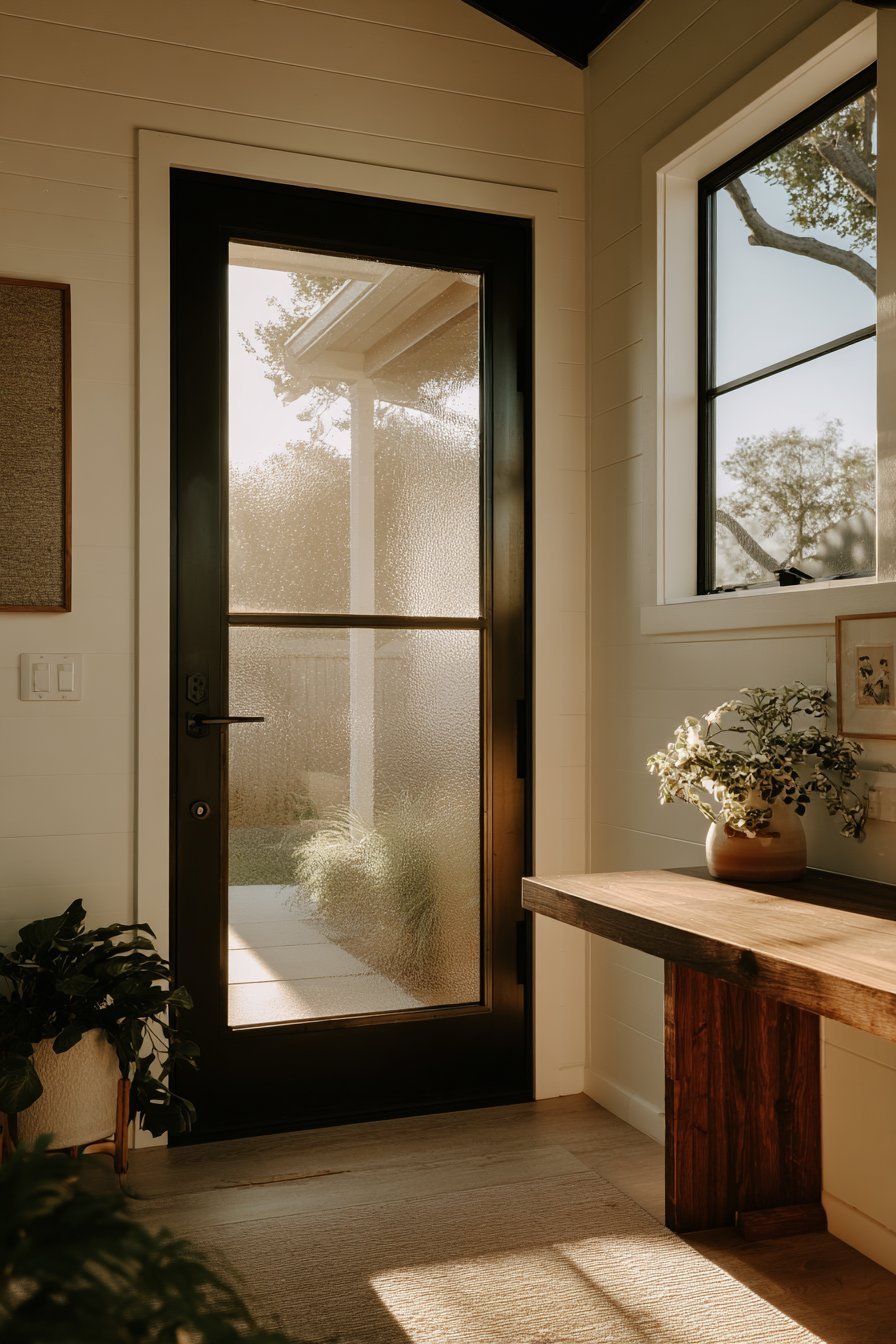The door’s design demonstrates how functional requirements need not compromise aesthetics. Privacy concerns dissolve through thoughtful frosted glass placement. Clear sections maintain visual connection to exterior without full transparency. The black metal grid framework adds contemporary structure. This balance makes the entrance feel both secure and welcoming.