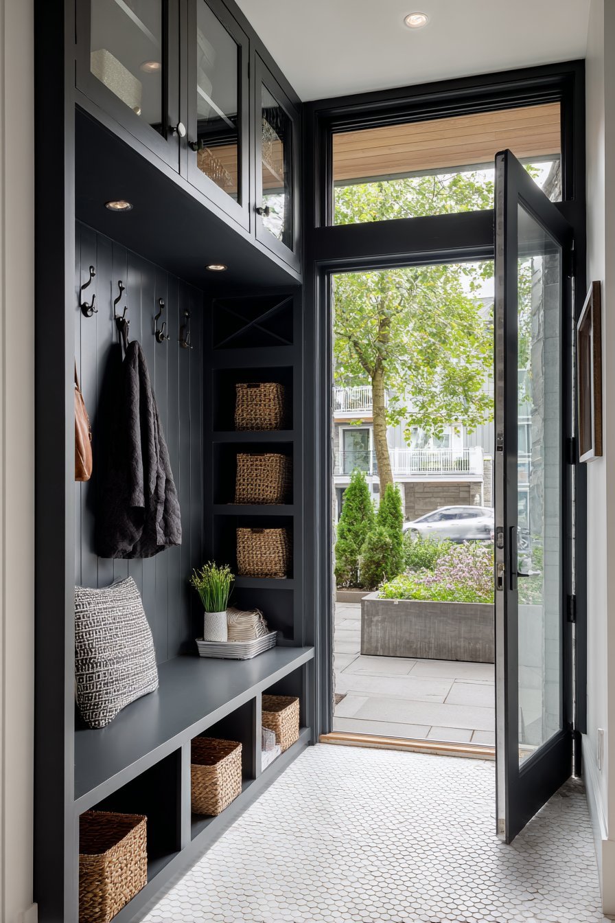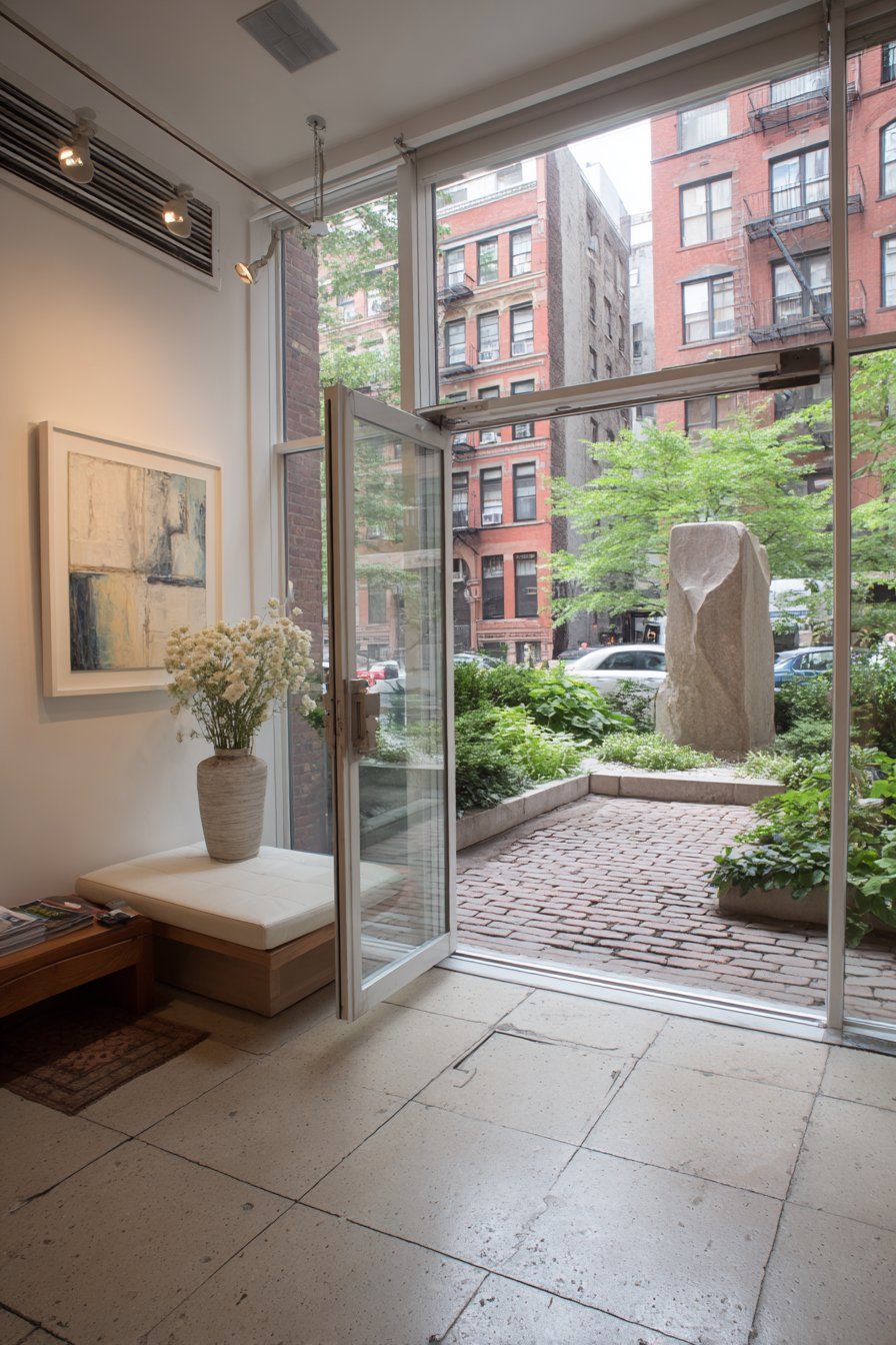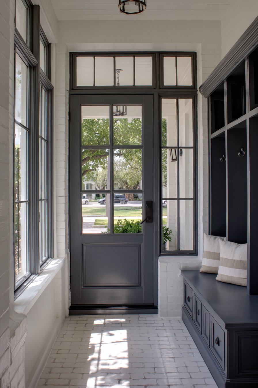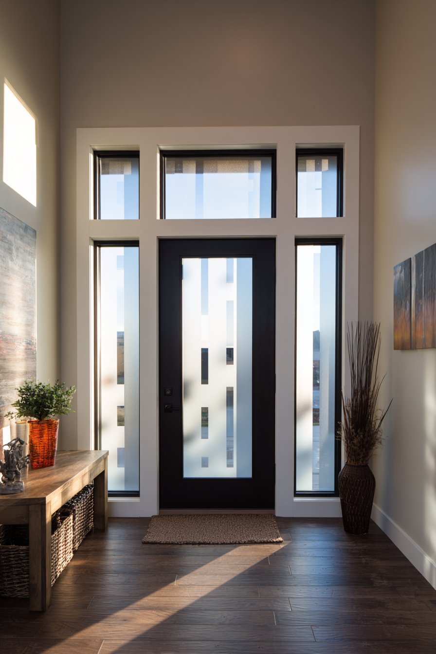 The door’s design demonstrates how functional requirements need not compromise aesthetics. Privacy concerns dissolve through thoughtful frosted glass placement. Clear sections maintain visual connection to exterior without full transparency. The black metal grid framework adds contemporary structure. This balance makes the entrance feel both secure and welcoming.