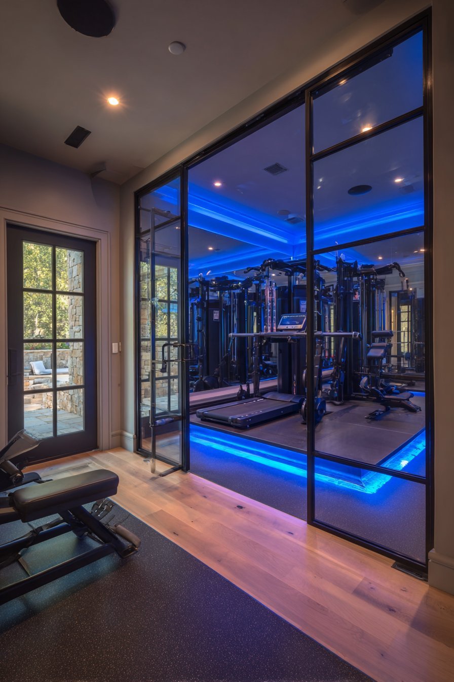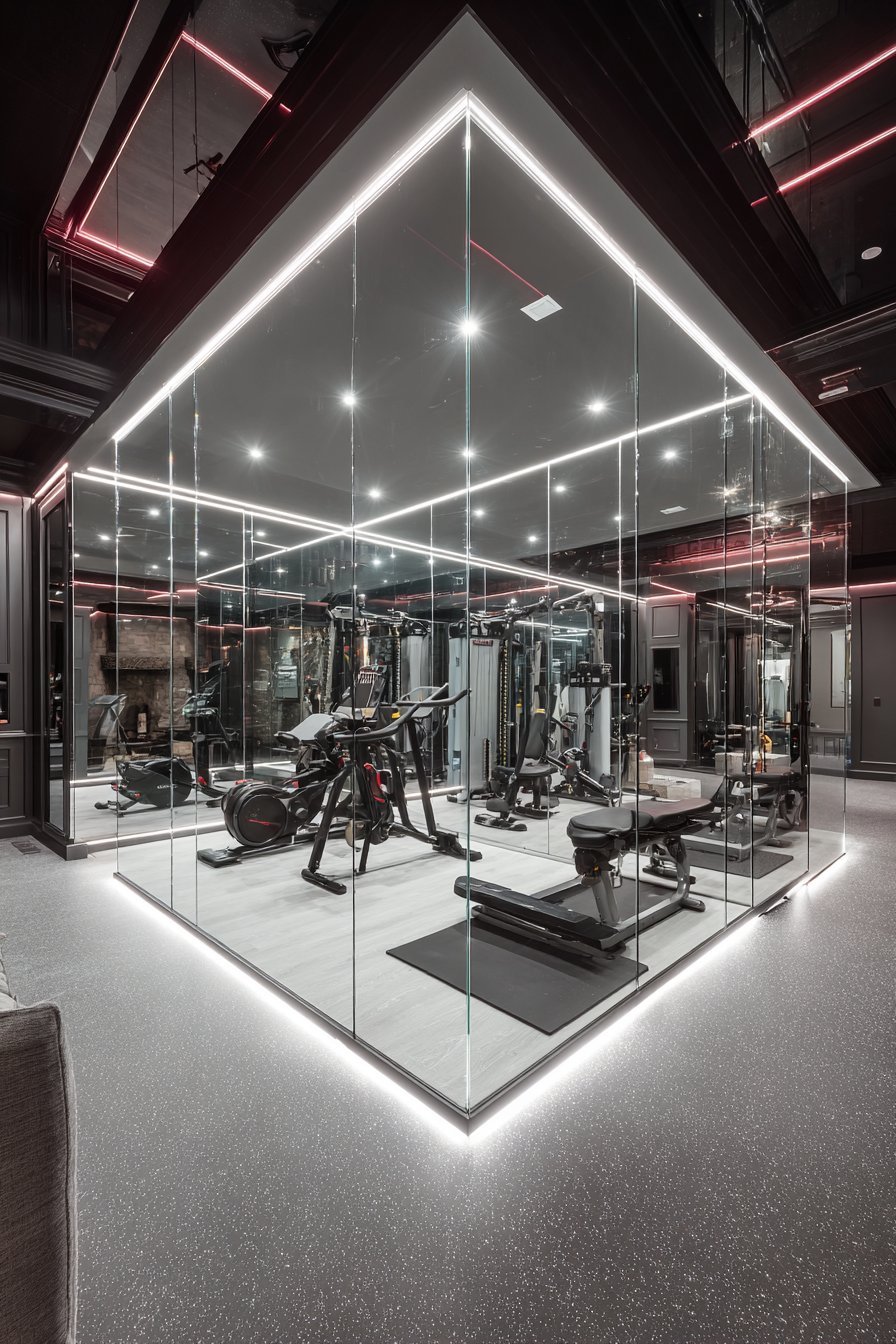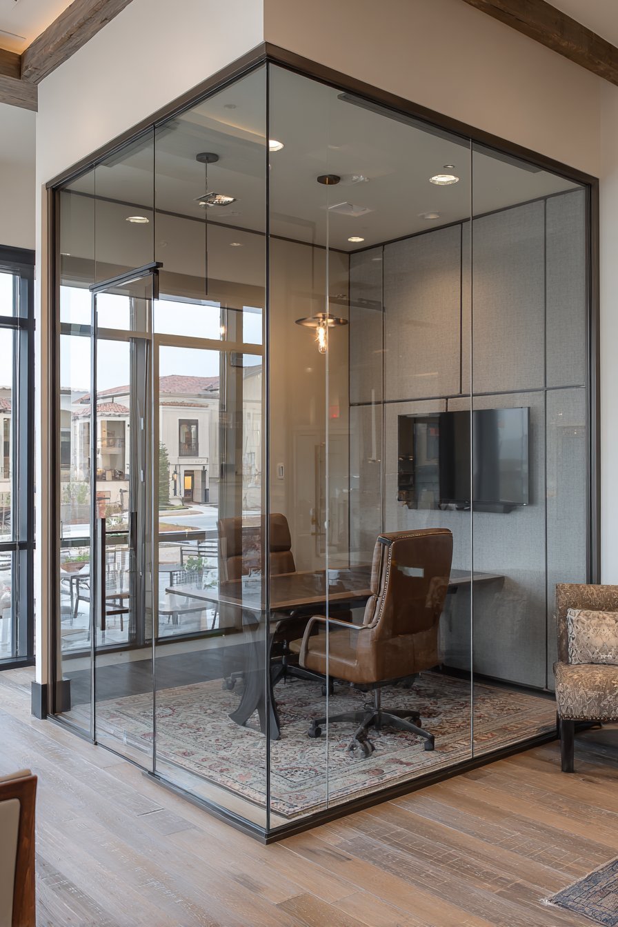 Acoustic panels on remaining walls control sound in the glass-enclosed space. The professional conference room aesthetic supports focused work activities. Bronze finish adds warmth to otherwise cool glass and metal. Quality construction rivals commercial office installations in residential settings.