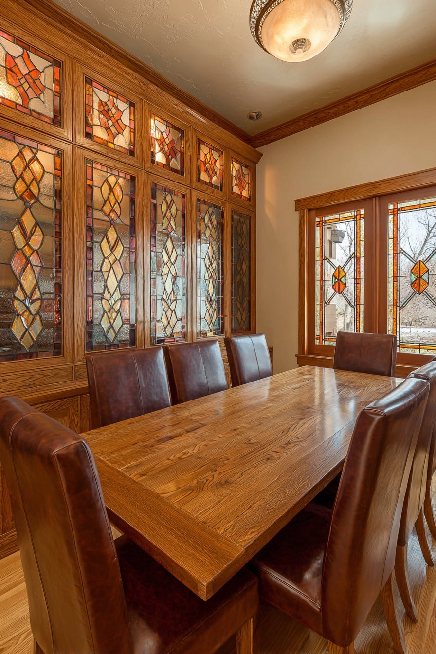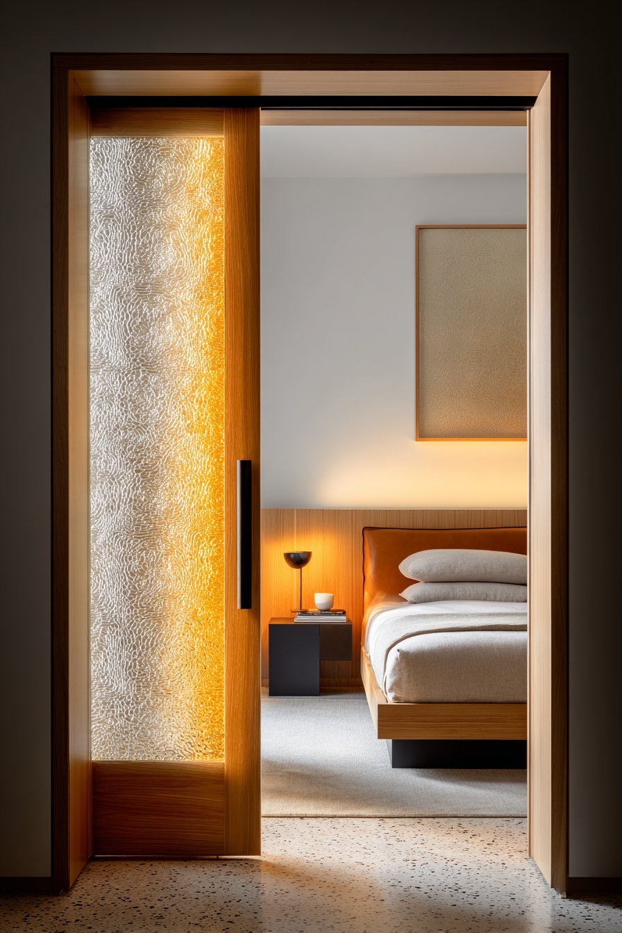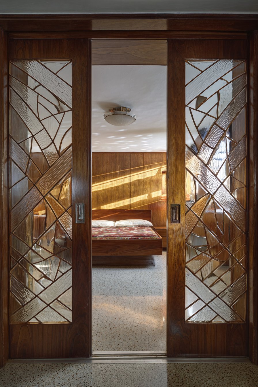 Period-appropriate furnishings complete the cohesive mid-century aesthetic. The doors’ length creates striking horizontal lines across the bedroom wall. Soft diffused lighting emphasizes textured glass patterns throughout the day. These original architectural elements significantly increase property value for design-conscious buyers. Preserving such features honors the home’s architectural heritage.