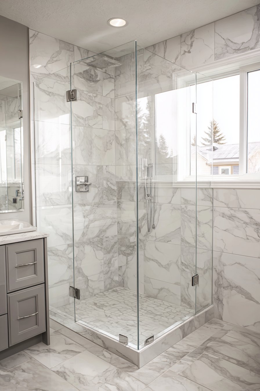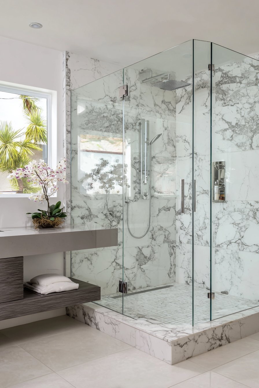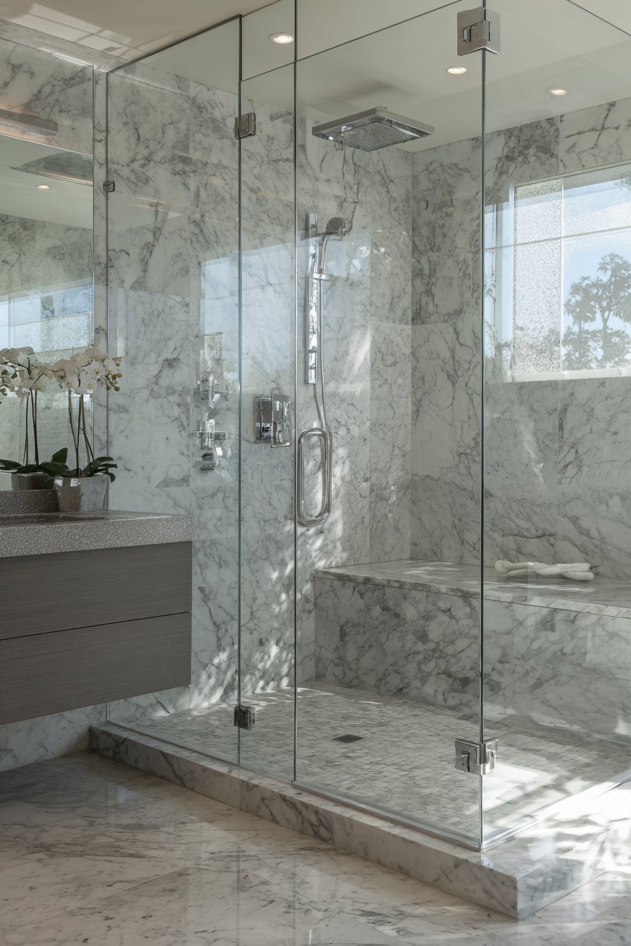 Frameless glass shower enclosures represent the pinnacle of bathroom luxury. Three-eighths inch thick tempered glass panels require minimal chrome hardware. The transparent walls showcase white marble tile with grey veining extending floor-to-ceiling. A rainfall showerhead and handheld wand gleam behind crystal-clear glass surfaces.