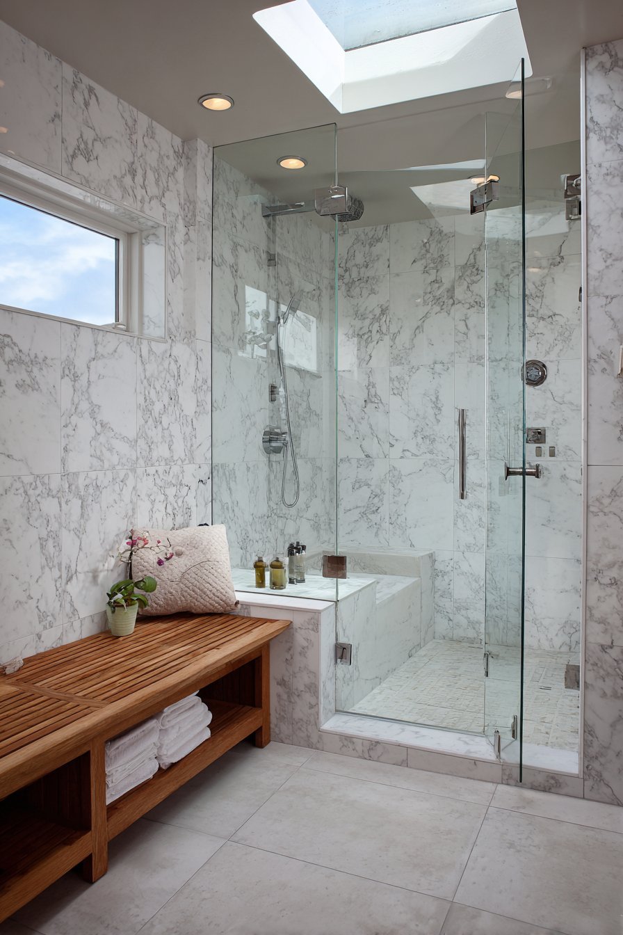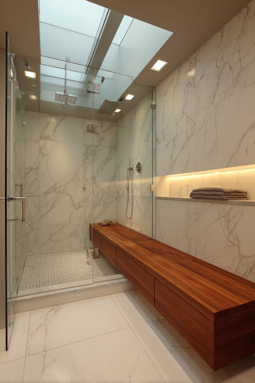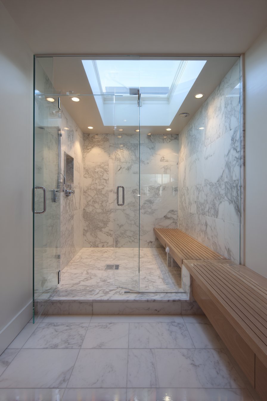 Frameless glass shower enclosures represent the pinnacle of bathroom luxury. Three-eighths inch thick tempered glass panels require minimal chrome hardware. The transparent walls showcase white marble tile with grey veining extending floor-to-ceiling. A rainfall showerhead and handheld wand gleam behind crystal-clear glass surfaces.