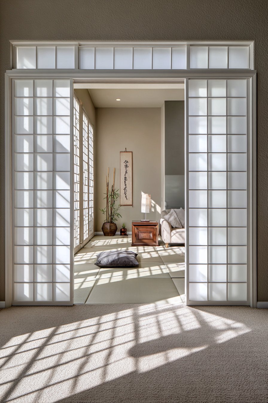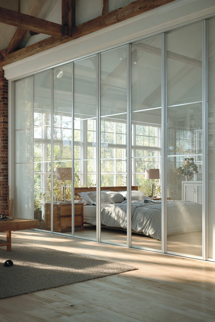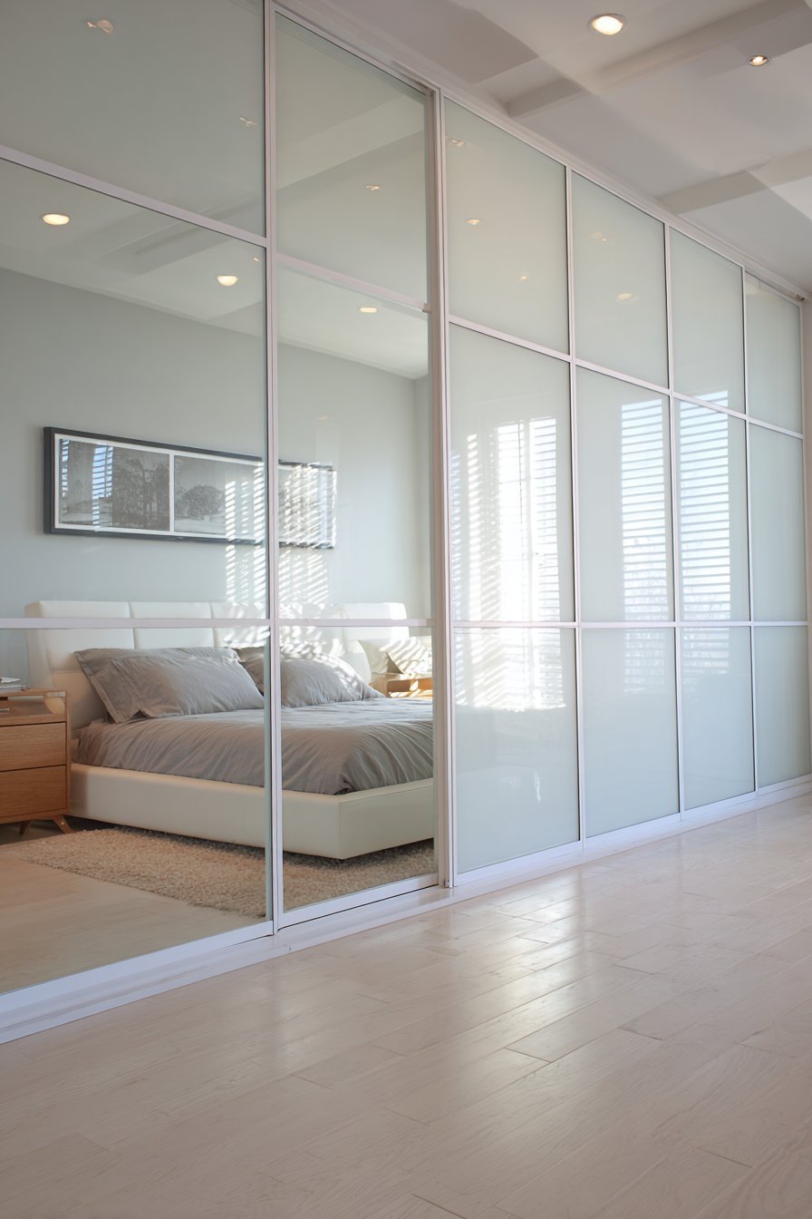 This approach transforms closet doors from purely functional to design elements. The frosted glass maintains privacy while bouncing light around the room. Sliding mechanism eliminates door swing space requirements. The white frames disappear against white walls for seamless integration. This design celebrates simplicity and natural light maximization.