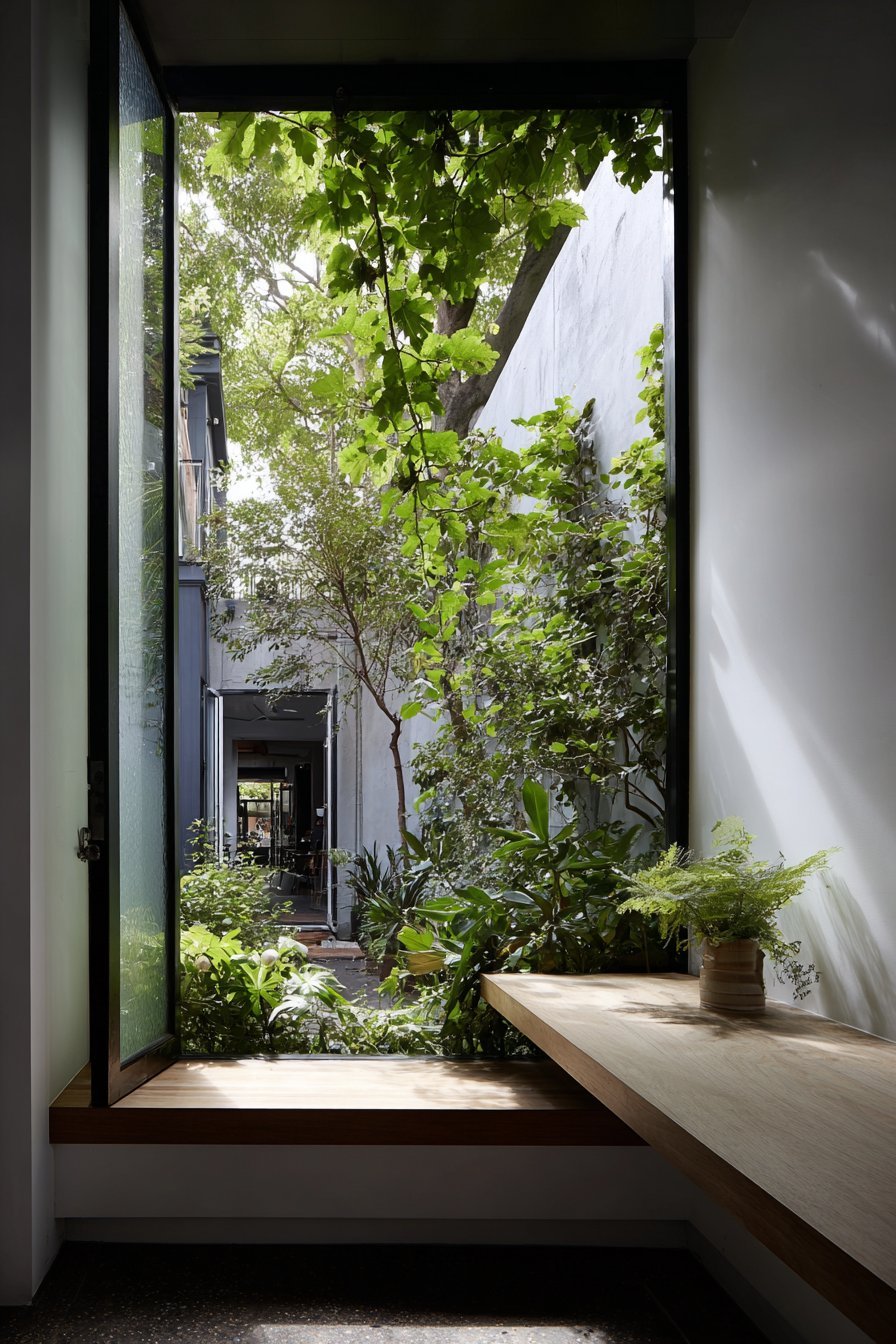 Morning light streams through the glass, reducing dependence on artificial lighting. This natural illumination reduces eye strain during computer work. The courtyard view provides visual breaks that support mental wellbeing. The frosted lower section prevents distracting movement while maintaining overall brightness. This thoughtful design supports both productivity and comfort.