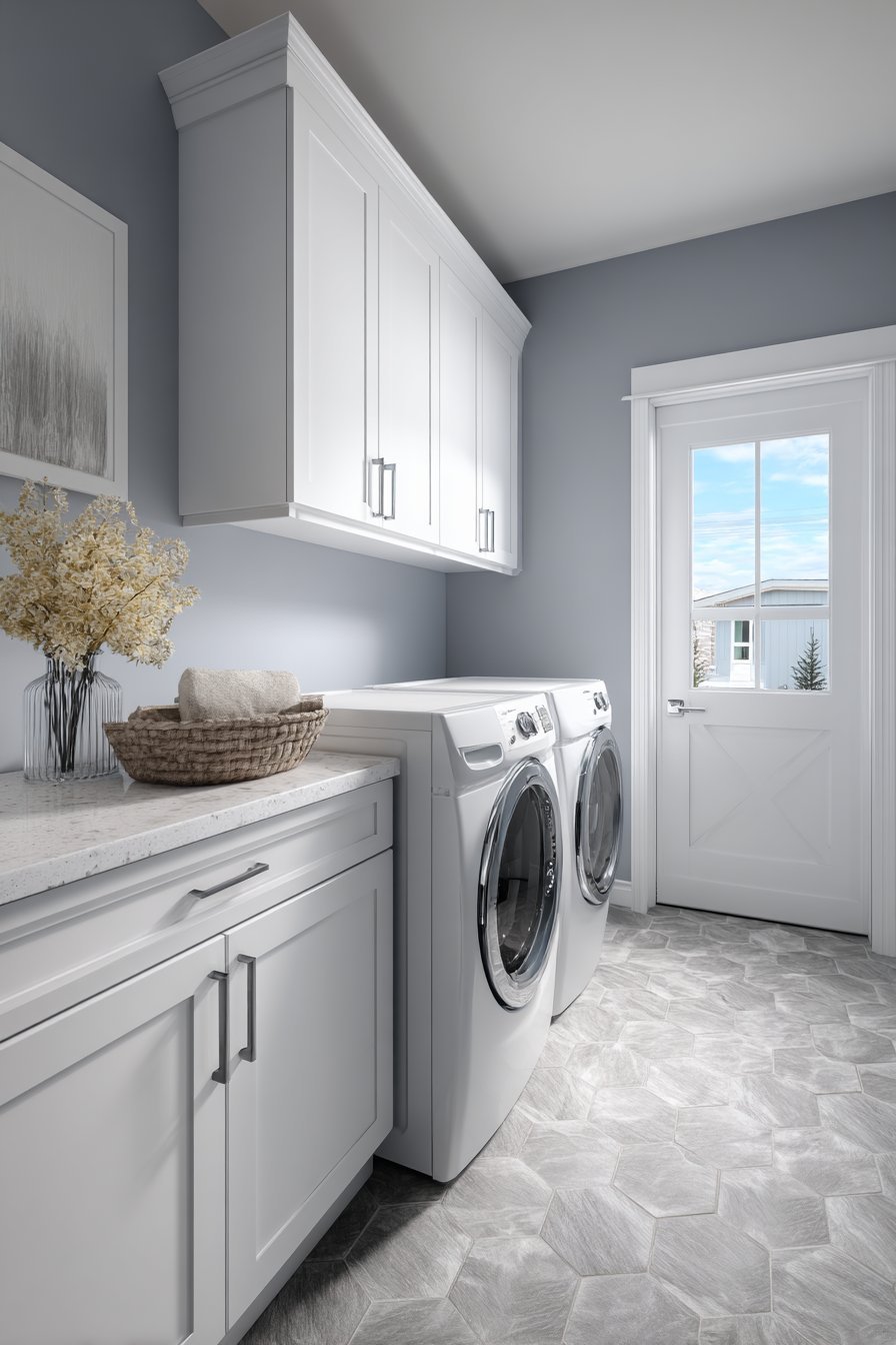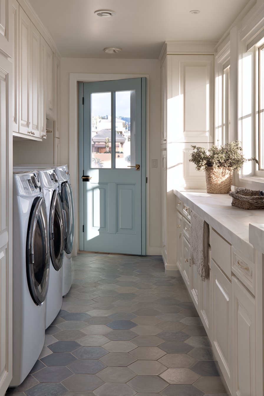 Hexagonal cement tile flooring adds pattern interest to a utilitarian space. The split door design balances privacy needs with openness desires. Natural light from nearby window supplements the borrowed light. The blue-grey paint adds personality to often-overlooked utility room.