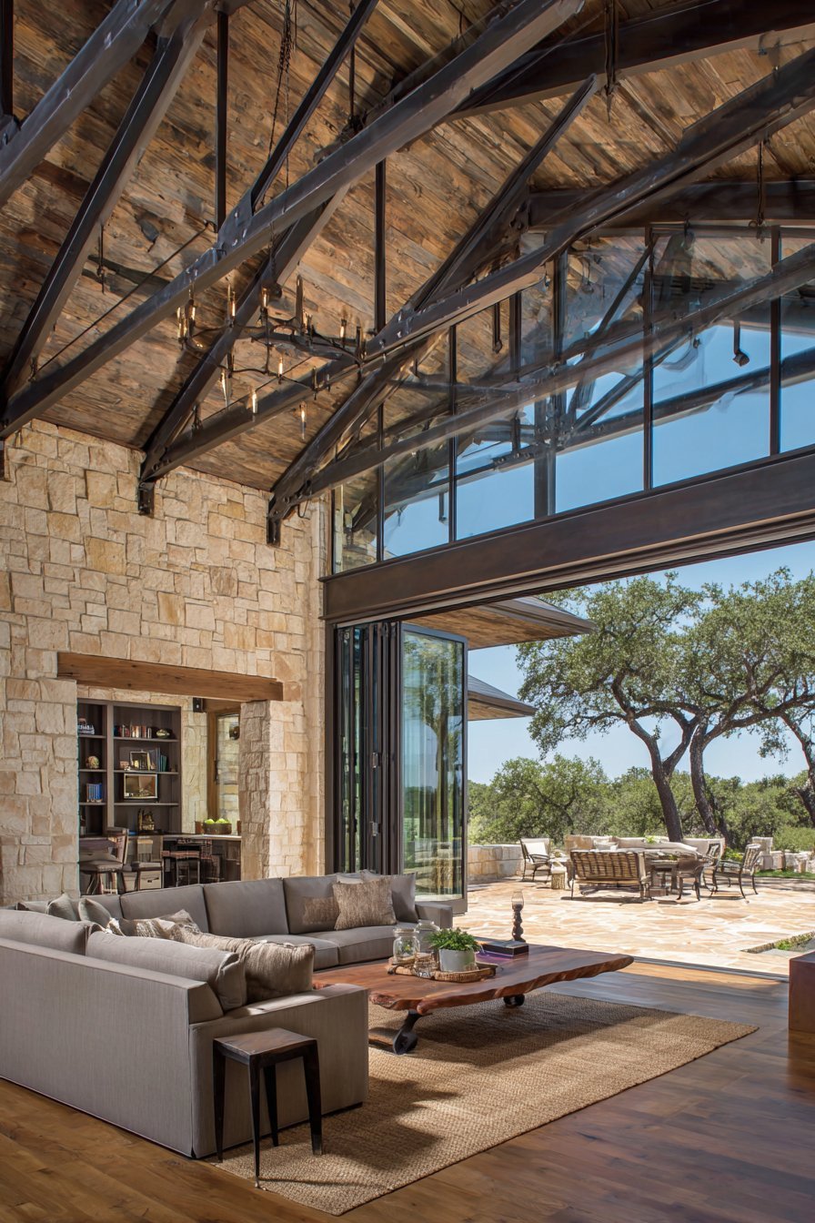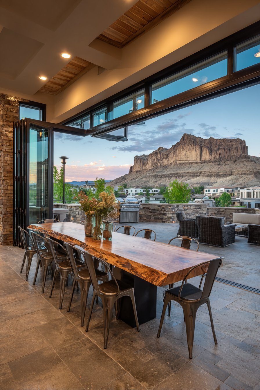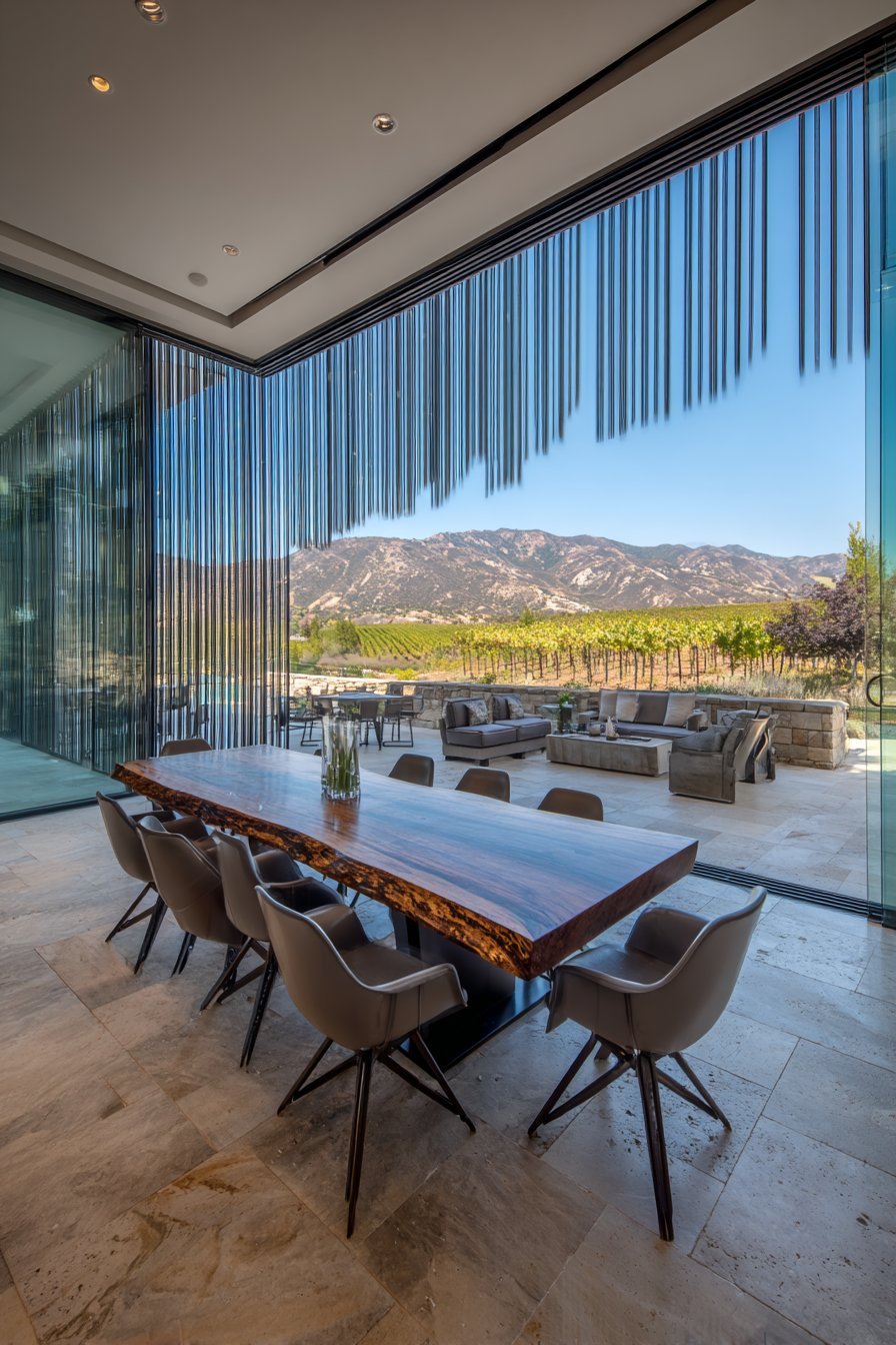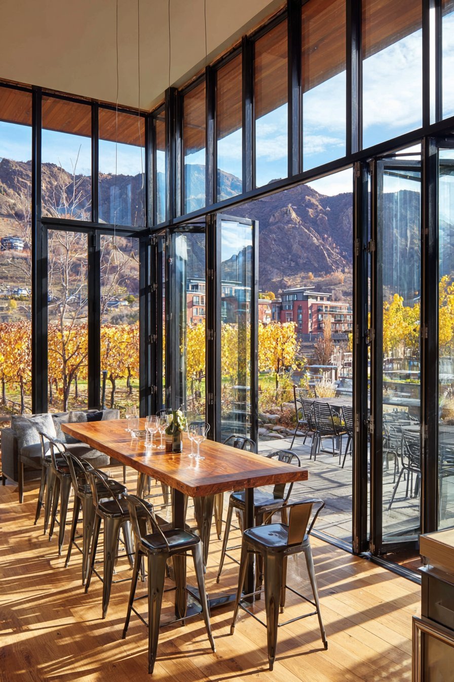 Accordion-style glass folding doors create dramatic opening to outdoor spaces. Narrow vertical glass panels in black aluminum frames fold completely aside. When fully open, the sixteen-foot wide opening connects tasting room to vineyard terrace. Live-edge wood table with modern metal-legged stools centers the interior.