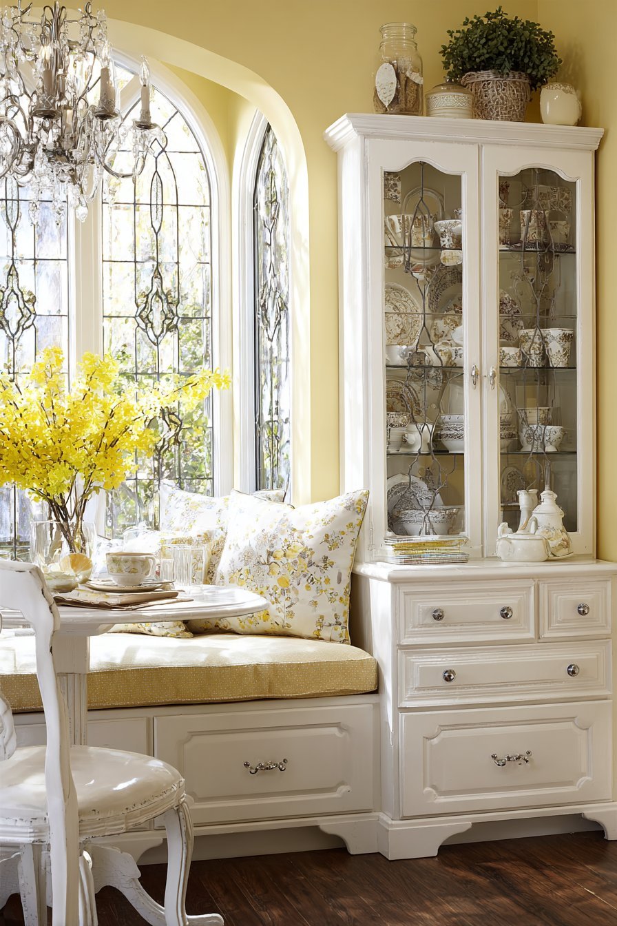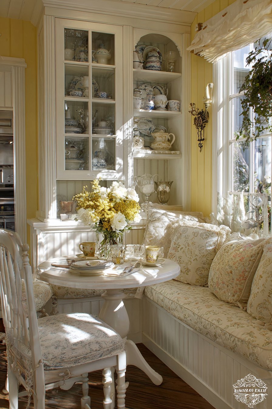 Round pedestal table complements the cottage charm perfectly. Beadboard wainscoting and soft yellow walls maintain cheerful atmosphere. Natural light from nearby window illuminates display cabinet contents. Morning light creates gentle reflections on glass surfaces throughout the space.